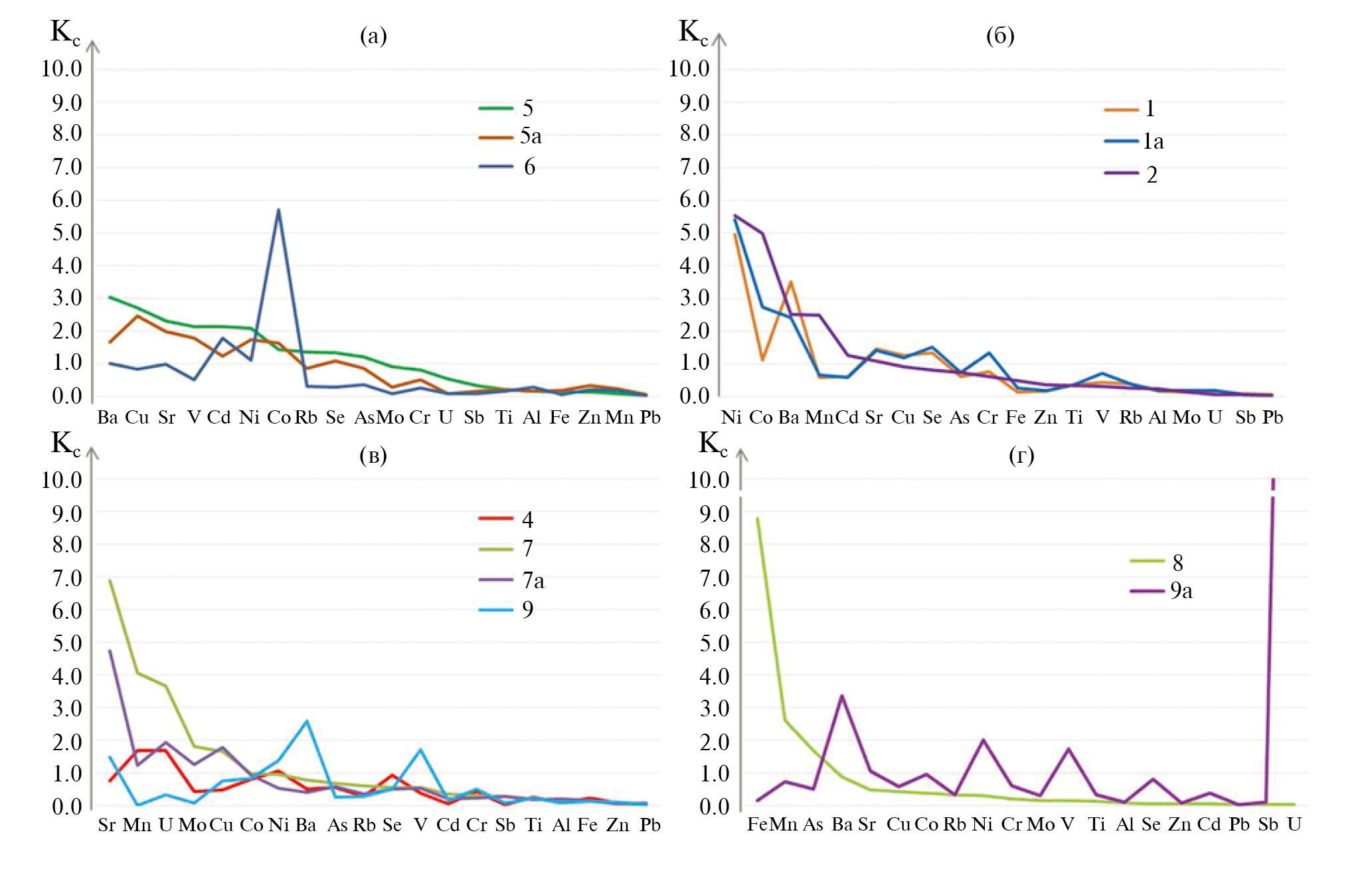 Рис. 3. Средние значения коэффициентов концентрации микроэлементов (относительно ПВЗВ) в воде изученных родников: а – калининский аллювиальный и локально-слабоводоносный микулинско-калининский озерно-болотный горизонты; б – волжский водоносный горизонт; в – донской-московский водно-ледниковый водоносный горизонт; г – воды спорадического распространения в бат-келловейских отложениях и верхнегжельский водоносный горизонт.