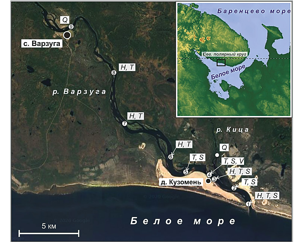 Рис. 1. Нижнее течение р. Варзуги на космоснимке (Google Earth): H, T, S – места установки автоматических приборов, измеряющих уровень, температуру и соленость воды соответственно; T, S, V – полусуточная станция с измерением скорости, температуры и солености воды (рейдовая вертикаль); Q – места измерения расходов воды; 1–8 – пункты экспедиционных наблюдений от устьевого створа; 9 – гидрологический пост р. Варзуга – с. Варзуга.
