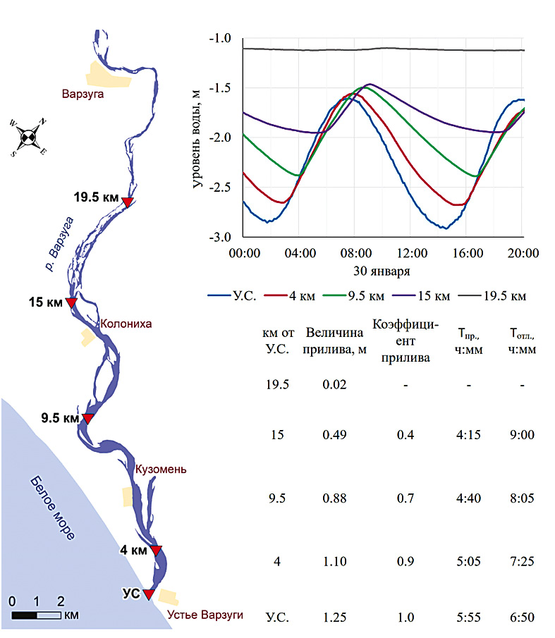 Исследования, проведенные в устье р. Варзуги зимой 2020 г., показали следующее. Для нижнего течения реки характерно сильное влияние морских приливов, которое выражается в соответствующих колебаниях уровня, а также в периодическом возникновении обратных (приливных) течений и интрузии осолоненных вод. Наибольшая дальность распространения приливов и осолонения в реку составила 20 и 7.5 км соответственно.