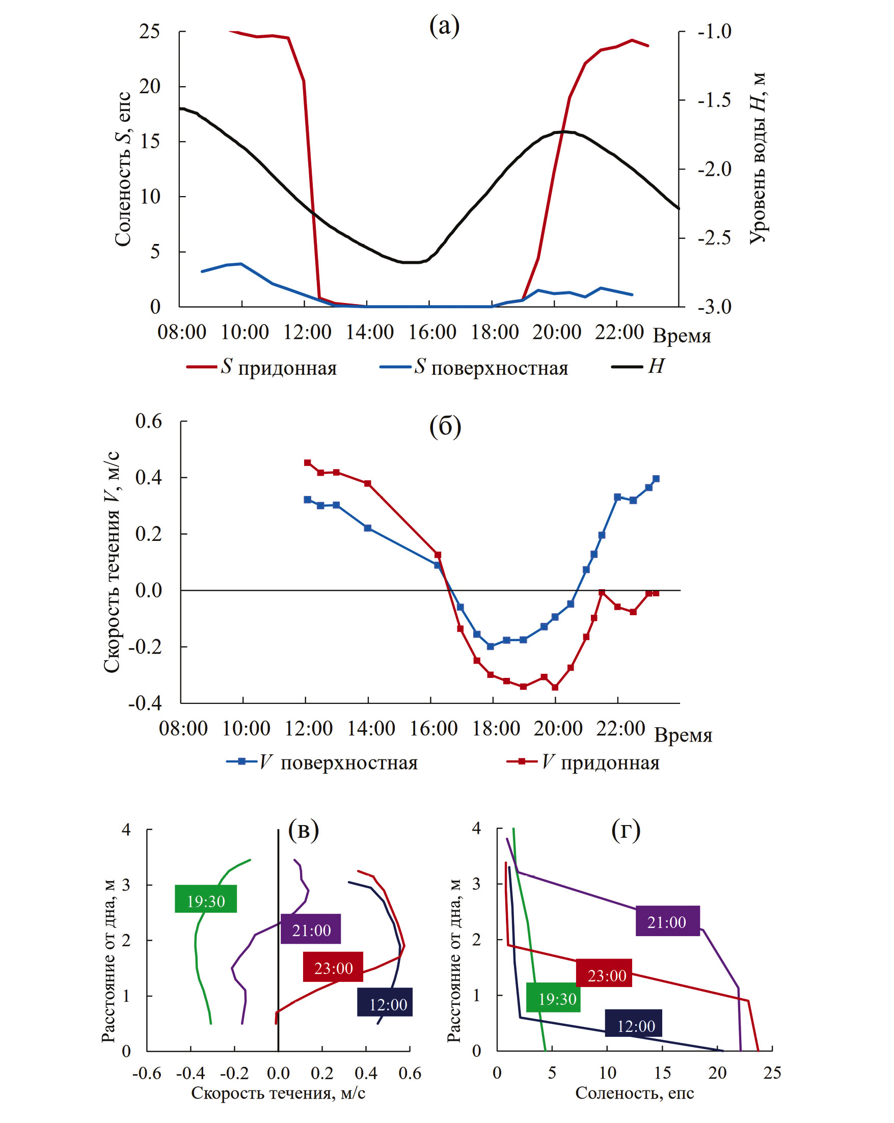 Наблюдения начались через 0.5 ч после ПВ, а завершились спустя 2.5 ч после ПВ. Таким образом, ими был охвачен весь полусуточный приливной цикл. С начала наблюдений и до ~15:30 уровень воды в эстуарии падал (был отлив). Затем до ~20:20 наблюдался прилив, а после него – снова отлив (рис. 4). В течение 3 ч после начала измерений (т. е. в первую половину отлива) в придонном слое сохранялась высокая соленость (до 20 епс), хотя большая часть водной толщи уже была пресной (рис. 5). При этом вода на всех горизонтах текла в сторону моря. Только в середине отлива (между 12:00 и 12:30) соленость у дна резко уменьшилась с 20 до 0.8 епс и на рейдовой вертикали не осталось осолоненных вод. Именно в этот период скорость отливного (прямого) течения достигла своего максимума 0.49 м/с в середине водной толщи (на глубине 1.6–1.7 м от дна), 0.32 и 0.43 м/с на поверхности и у дна соответственно (рис. 4). Затем скорость отливного течения постепенно ослабевала.