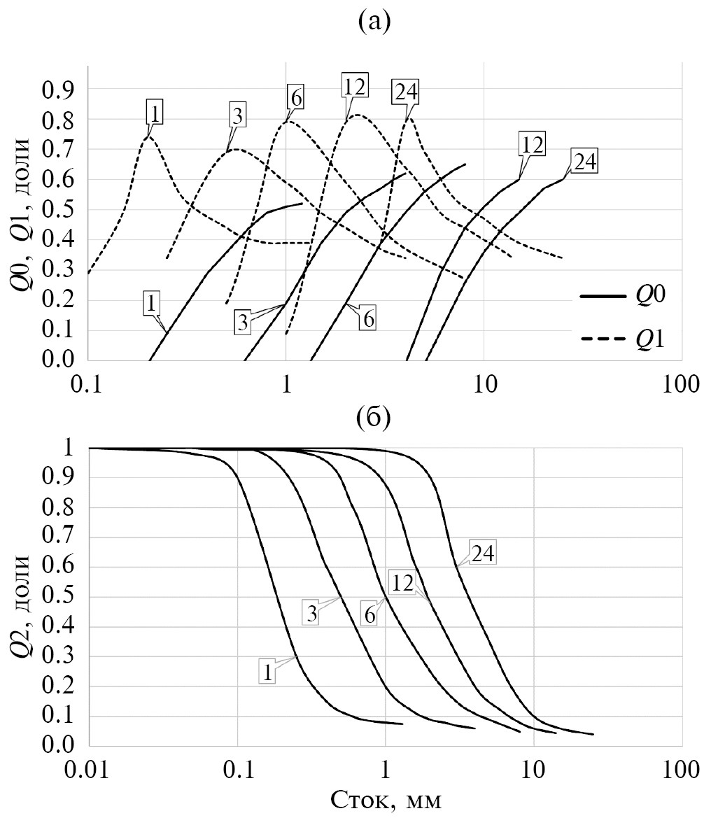 Снижение доли грунтовых вод и начало формирования почвенного стока для водосборов площадью 3.1–3.5 км2 при различных расчетных шагах наблюдаются при достижении расходов 0.4–3.0 мм. Для водосборов с площадью 7.6–26.3 км2 диапазон уменьшается до 0.05–2.0 мм. Максимальное абсолютное значение Q1, при котором происходит формирование поверхностного стока, для этих же водосборов составляет 1.3–8.0 и 0.1–5.0 соответственно. Точка пересечения графиков долей стока Q0 и Q1, соответствующая переходу к доминированию поверхностного стока и формированию высоких паводков, для всех расчетных шагов моделирования остается приблизительно постоянной – 0.45–0.5. В то же время при увеличении расчетного шага по времени от 1 до 24 ч абсолютные значения модельных расходов воды (мм) увеличиваются в ~2 раза (рис. 5). В целом, полученные соотношения долей генетических компонентов стока согласуются с региональными представлениями о стокоформировании и результатами ранее выполненных исследований, в которых также делается вывод о существовании особого, критического расхода воды в замыкающем створе, который отражает наполнение условных бассейновых емкостей и начало формирования поверхностного стока на водосборе [2, 9, 11].