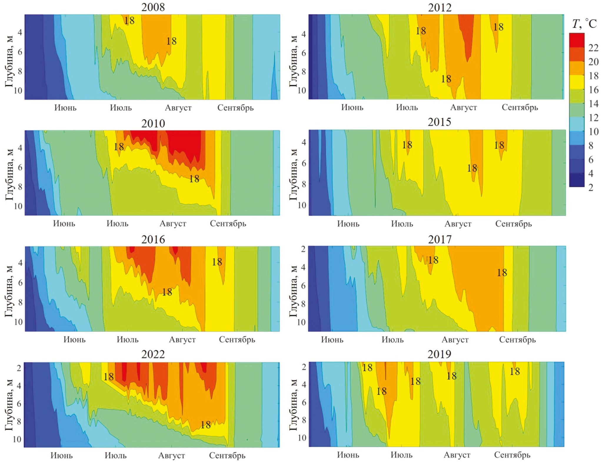 Рис. 1. Температура воды в центральной глубоководной части оз. Вендюрского в разные по погодным условиям годы. Подписана изотерма 18°С. На левых панелях показаны годы с продолжительной стратификацией, на правых – с повторяющимися эпизодами перемешивания водной толщи