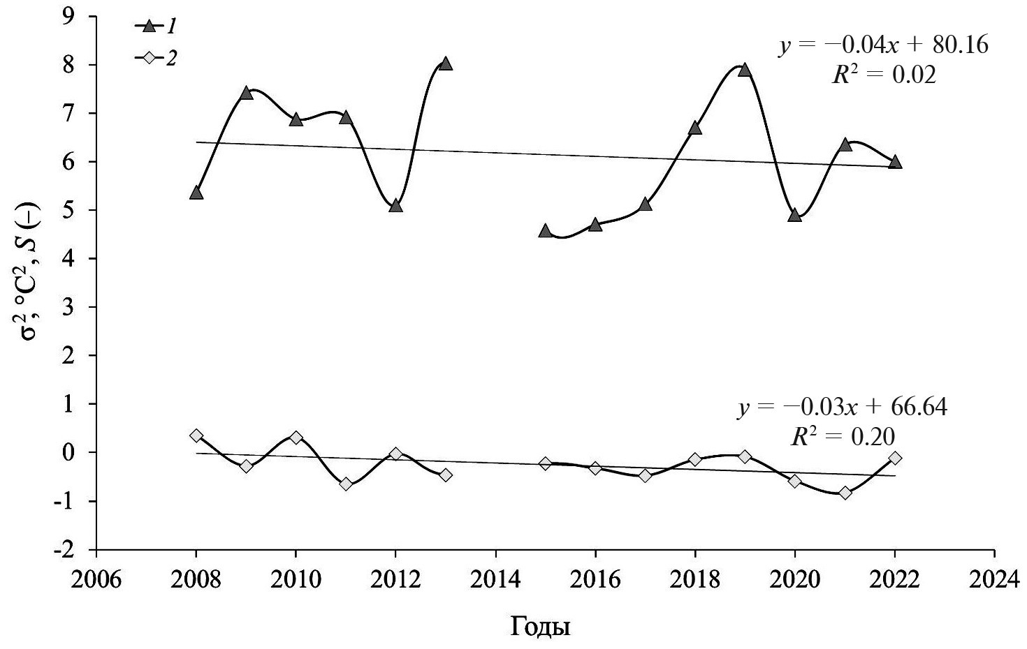 В целом средние значения ∆T по годам менялись незначительно. В то же время высшие моменты функции распределения, в первую очередь – дисперсия σ2 и асимметрия S, оказались весьма изменчивыми (рис. 8).