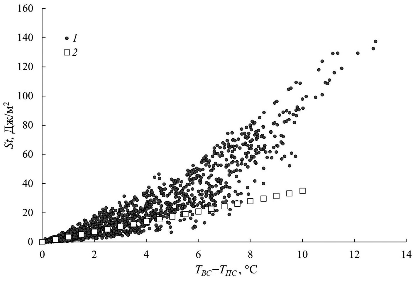 Рис. 9. 1 – разница температуры воды верхнего (ТВС) и придонного (ТПС) слоев оз. Вендюрского и соответствующие им значения St за все годы измерений; 2 – зависимость, рассчитанная с учетом характерных значений H = 5.3 м (средняя глубина оз. Вендюрского) и α ~ 2×10–4 °C–1