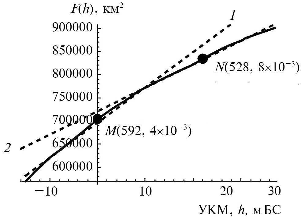 Рис. 1. Зависимость площади акватории Каспия от уровня моря F(h), по данным [16], сплошная линия; координаты точек M и N – равновесные уровни и площади акватории Каспия для РХвТ и ПХвТ соответственно; прямые пунктирные линии 1 и 2 – линейные аппроксимации зависимости F(h) в окрестностях точек M и N соответственно