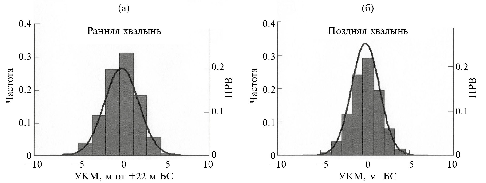 Рис. 3. Гистограммы (столбики) и плотности распределения вероятности (линии) уровня Каспия: (а) для раннехвалынской, (б) для позднехвалынской трансгрессий