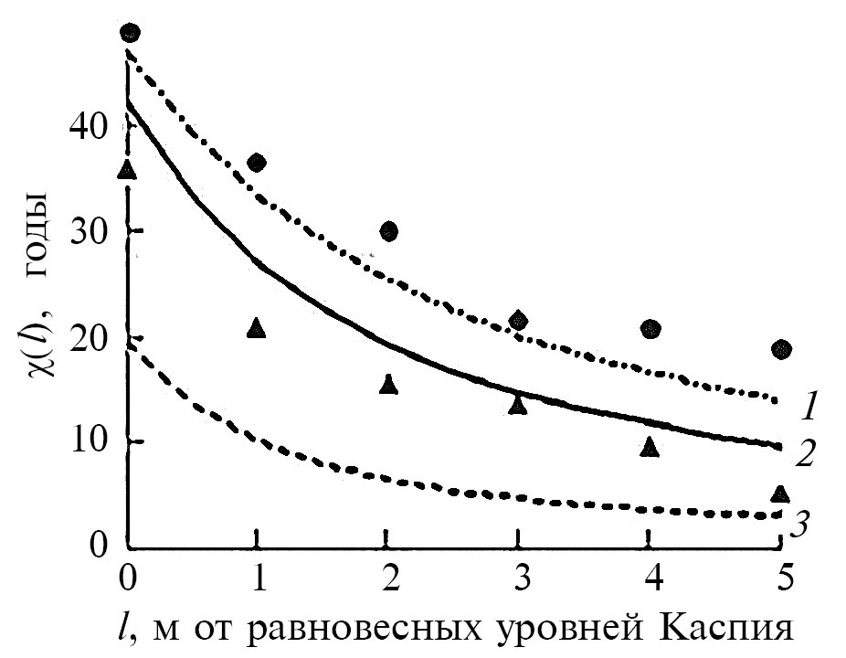 Разница между величинами χ(l) для РХвТ и ПХвТ объясняется влиянием меньшего параметра инерционности УКМ α = 4.1×10–3 год–1 во время РХвТ по сравнению с величиной α = 6.9–8.1×10–3 год–1 во время ПХвТ. Для сравнения, в отсутствие оттока из Каспия в зал. Кара-Богаз-Гол современная величина α ~ 3×10–2 год–1.