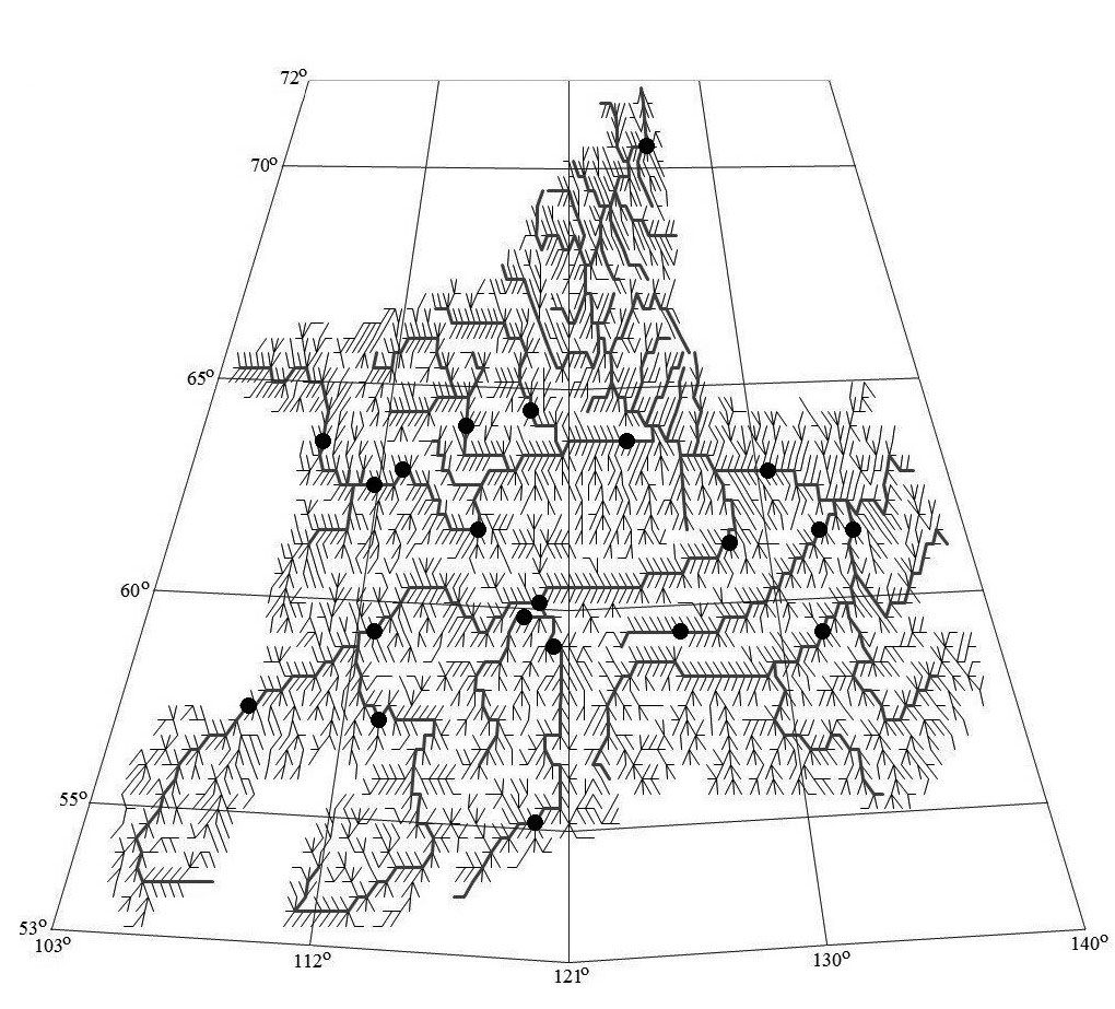 Рис. 2. Модельная гидрографическая сеть бассейна р. Лены со стоковыми станциями (черные кружки)