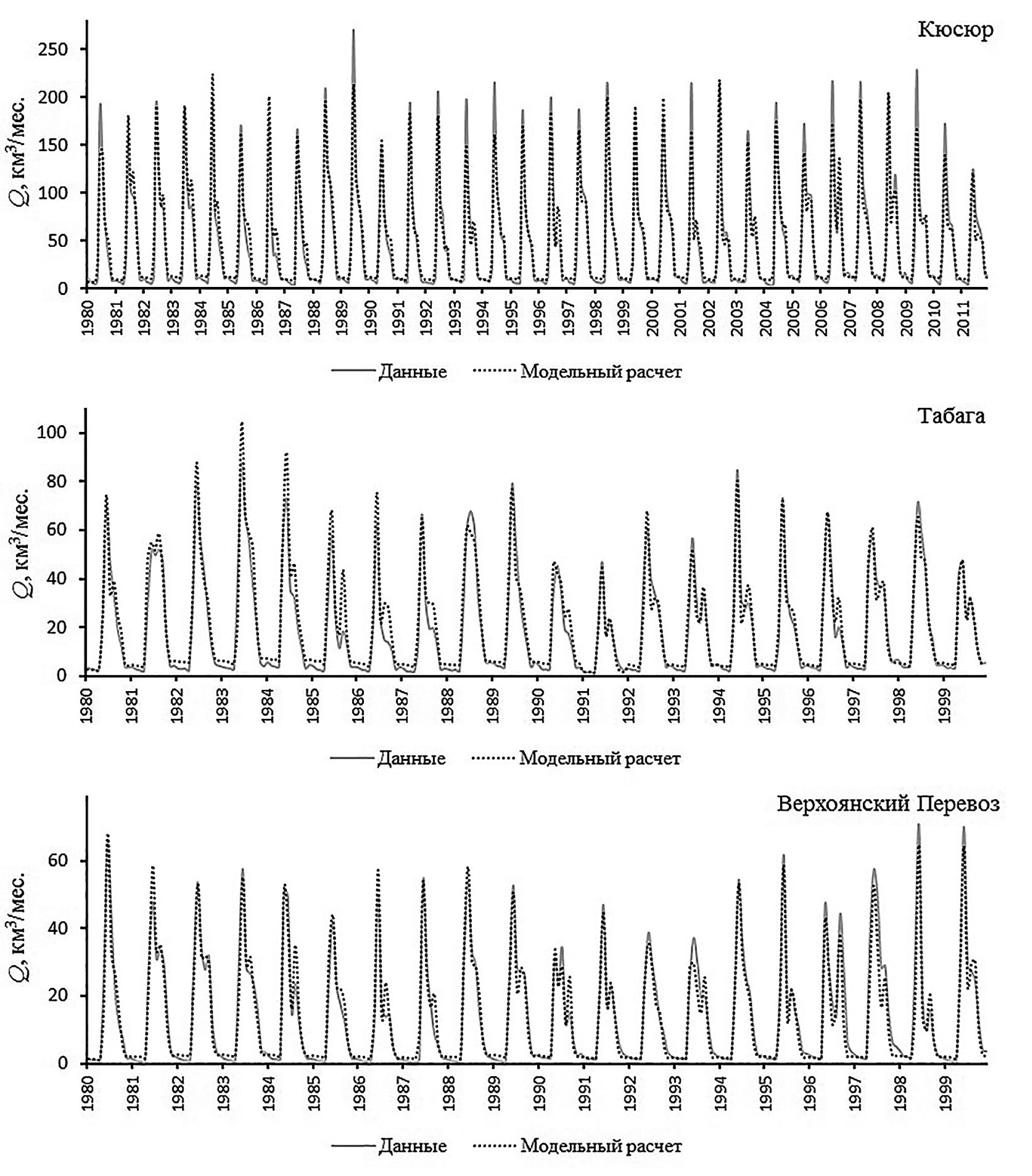 На рис. 4 приведены модельные месячные расходы в сравнении с наблюдаемыми гидрографами для трех стоковых станций. В целом на каждой из станций модельные расходы хорошо выражают наблюдаемый сезонный цикл: низкий сток с ноября по апрель, резкий пик в июне, связанный с таянием снега, и постепенное снижение стока с августа по апрель. Дождевой сток летом намного меньше, чем весенний паводок при таянии снега. Следует отметить, что в модели недооценивается максимальный сток в некоторые годы в июне в замыкающем створе Кюсюр. Это можно связывать как с ошибками в самой модели маршрутизации реки, так и с ошибками во входных данных формирования стока.
