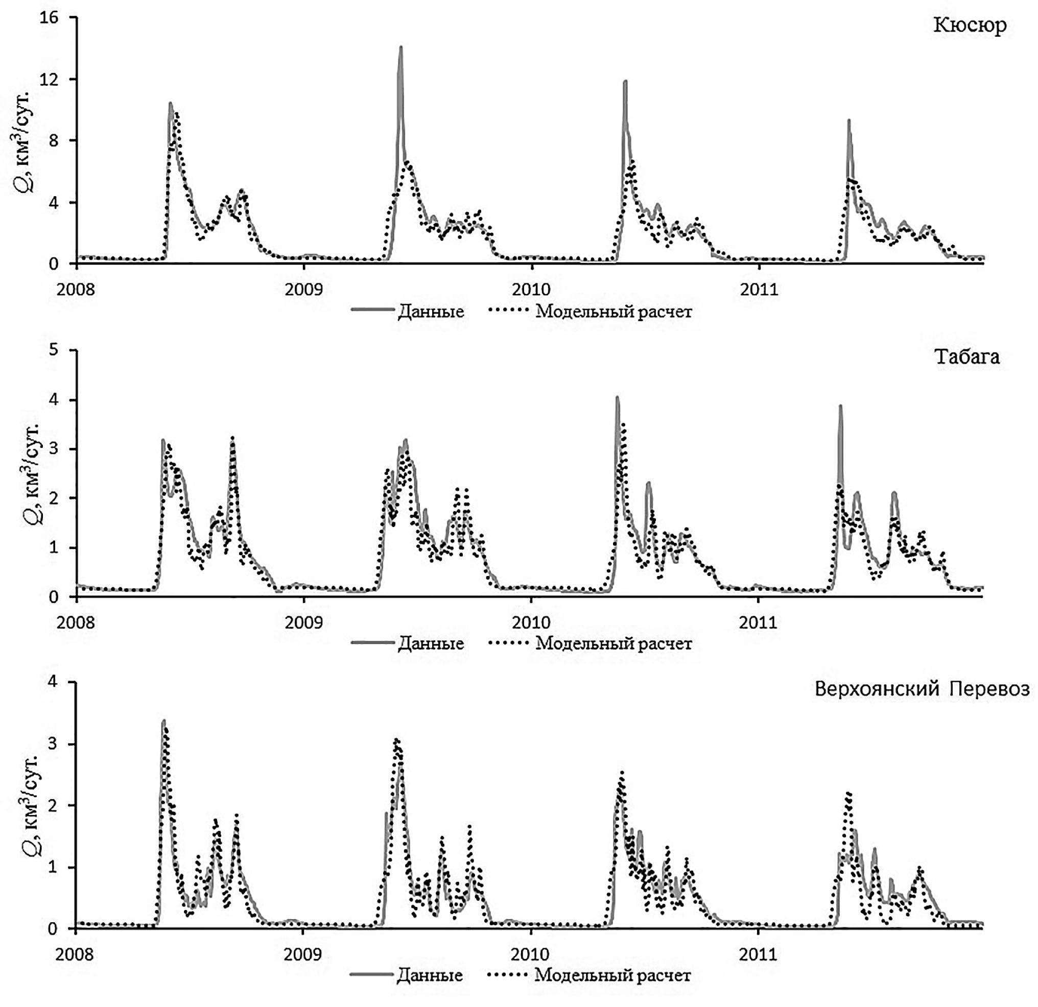 Суточное моделирование расходов проводилось за весь исследуемый период. Ввиду отсутствия в архиве R-ArcticNET суточных данных по речному стоку на стоковых станциях Табага и Верхоянский Перевоз сравнение результатов было возможным с данными с сайта АИС ГМВО (Автоматизированная информационная система государственного мониторинга водных объектов) за период с 2008 по 2011 г. [29]. Приведенные на рис. 5 суточные расходы на трех стоковых станциях, полученные по модели, находятся в хорошем согласии (с учетом неопределенности в наблюдениях) с суточными данными.