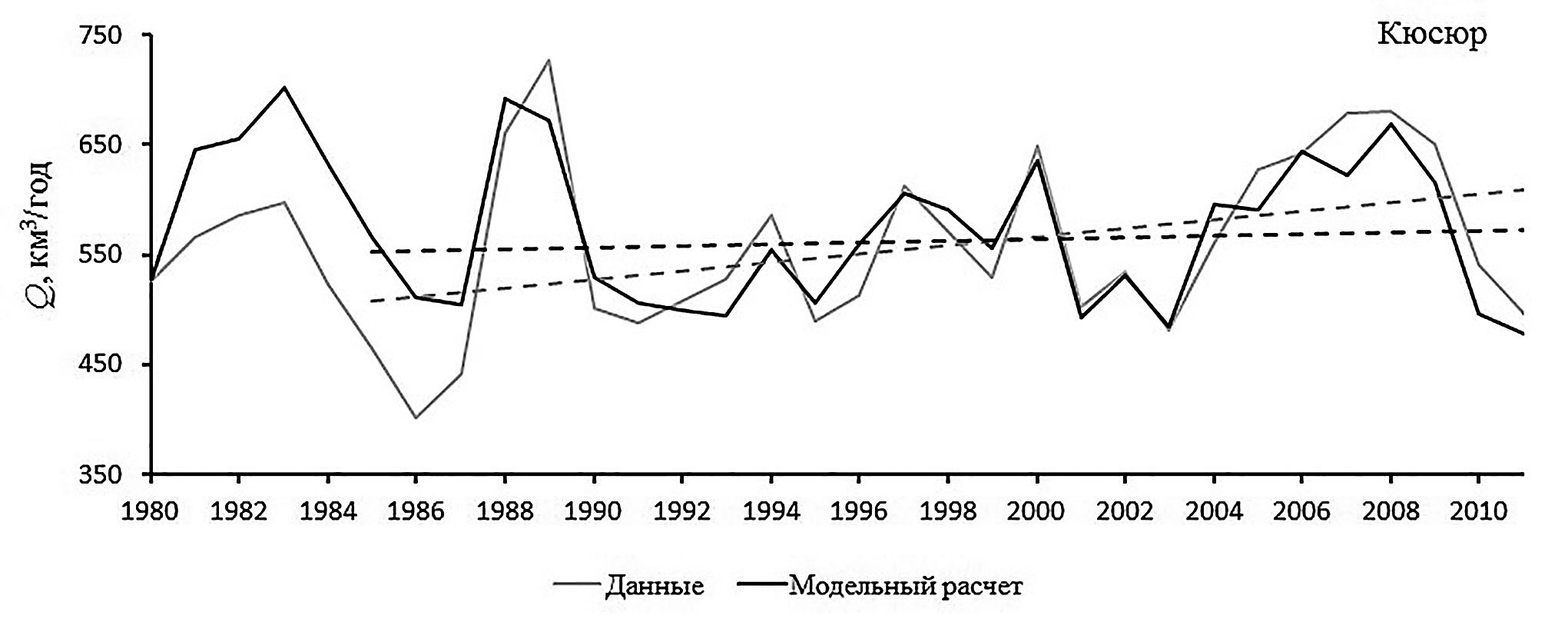 На рис. 6 представлена динамика смоделированного и наблюденного годового стока в замыкающем створе Кюсюр за период с 1980 по 2011 г. На рисунке пунктиром обозначены линейные тренды увеличения годового объема стока для периода исследования – с 1985 по 2011 г. Было возможно получить модельный тренд только начиная с 1985 г. По данным Росгидромета, со второй половины 1980-х гг. на территории бассейна произошло резкое повышение приземной температуры воздуха и увеличения количества осадков [15], что было одной из причин увеличения речного стока.