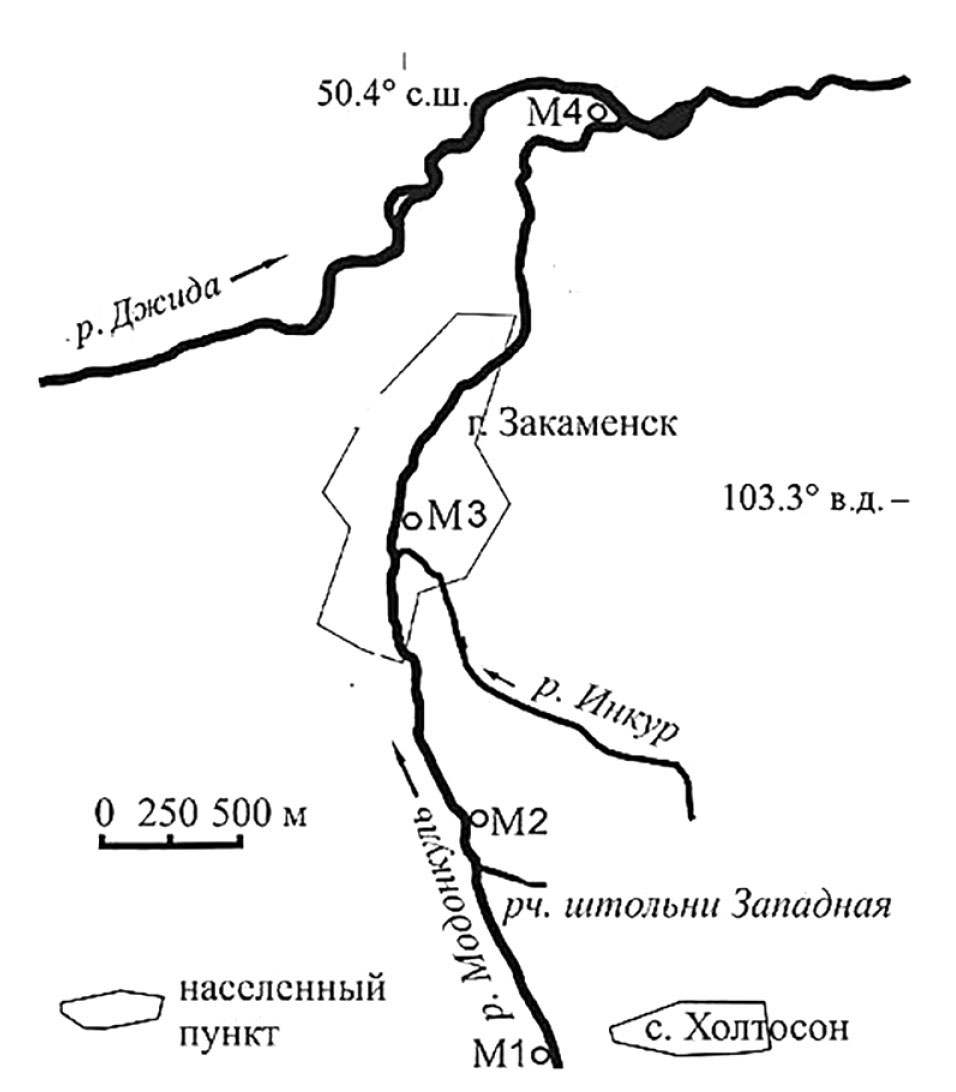 Вниз по течению до г. Закаменска река протекает по территории, не затронутой горнодобывающим производством. На створе М3 река дренирует грунтовые воды, формирующиеся на участках распространения аллювиальных отложений. После впадения руч. Инкур в створе М3 химический состав воды становится сульфатным кальциево-натриево-магниевого типа с минерализацией 267–472 мг/л, реакция воды – слабокисло-нейтральной с рН 6.1–7.6. По сравнению с предыдущим створом М2 минерализация воды уменьшается в 1.3 раза, SO42– –1.3, Na+ – 2.9, Са2+ – 1.5, Mg2+ – 1.7, F– – в 3 раза, а содержание HCO3- увеличивается в 1.1 раза.