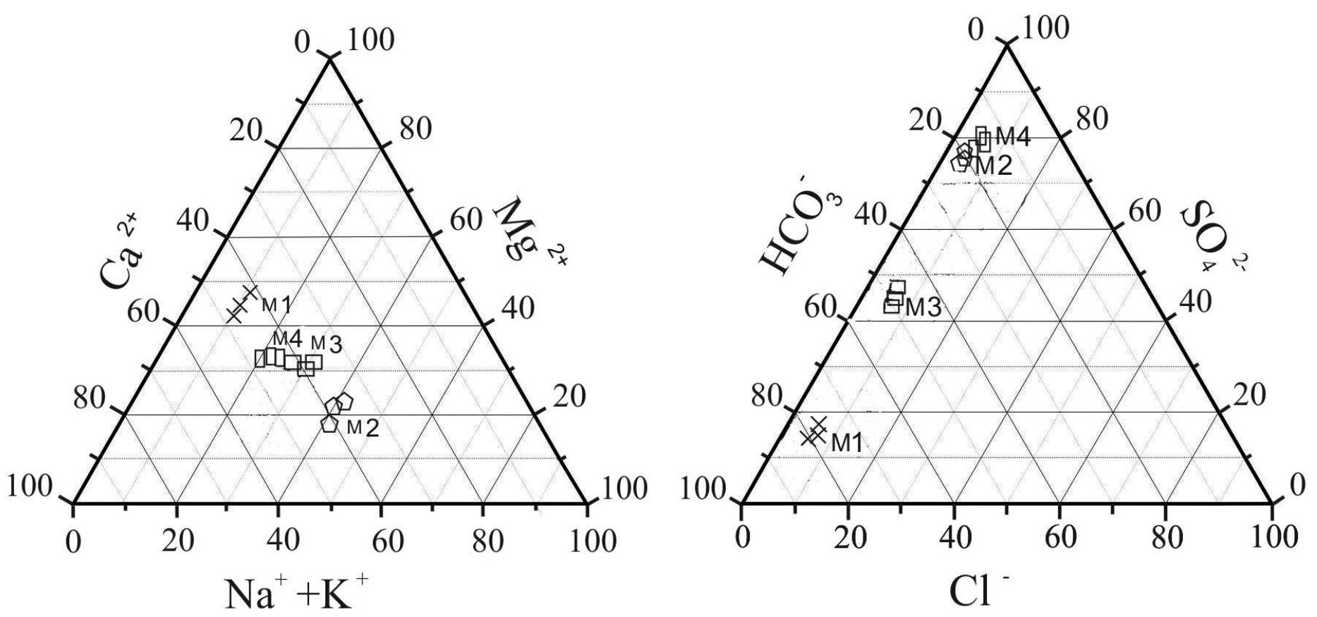 В верховье (створ М1) речные воды характеризуются минерализацией 159–204 мг/л (среднее 184.6 мг/л), слабощелочной средой рН 7.2 при вариации 7.0–7.7. По химическому составу воды гидрокарбонатные кальциево-магниевые. Катионы и анионы в порядке убывания концентраций выстраиваются в следующие ряды: Са2+ ≥ Mg2+ > Na++К+ и HCO3– > SO42- > Cl-, что характерно для природных речных вод, развитых в пределах магматических пород основного состава (рис. 2).