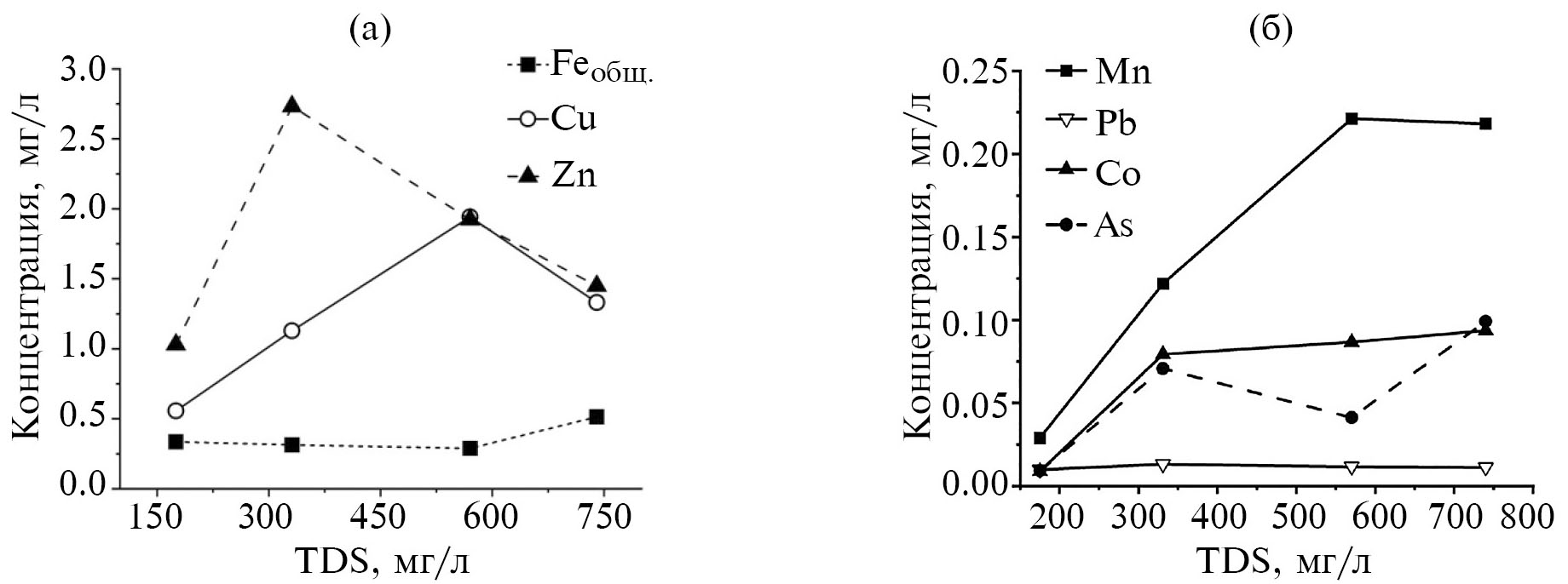 В воде р. Модонкуль, фильтрованной через “синюю ленту”, поведение микроэлементов меняется при росте минерализации воды. Об этом свидетельствуют графики, приведенные на рис. 3а, 3б. Зависимость содержаний Fe, Pb, Cu от минерализации не столь очевидна, что в основном обусловлено тем, что эти элементы связаны с нерастворимой частью минеральной матрицы пород и из большинства твердых отходов выщелачиваются в незначительных количествах (рис. 3а). С ростом минерализации наибольшая растворимость в воде наблюдается для соединений Mn, Cd, As, Co (рис. 3б). Вниз по течению реки содержания тяжелых металлов Cu, Zn, Pb возрастают в 1.1–1.4 раза, концентрации Mn, Co, As – в 6.6–11 раза, Cd – в 8 раз (табл. 4). Содержания изученных микроэлементов в воде реки меняются по сезонам года, наблюдается тенденция увеличения их в весной и после ливневых дождей: например, наибольшие содержания Cu весной были 2.3–2.6 мг/л, после дождей – 3.5 мг/л.