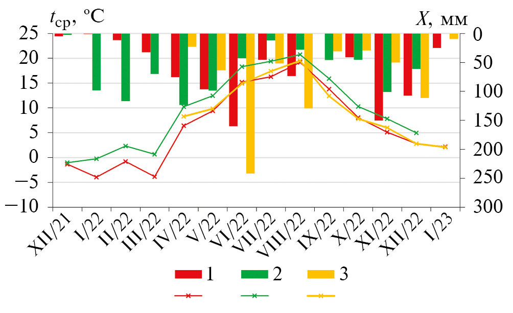 Рис. 2. Внутригодовое распределение месячных сумм осадков (X) и среднемесячной температуры воздуха (tср) по данным метеостанций: 1 – Ольмесхыр (cуммы осадков в период XII–III занижены), 2 – Многоречье, 3 – Караби (с IV/ 2022)