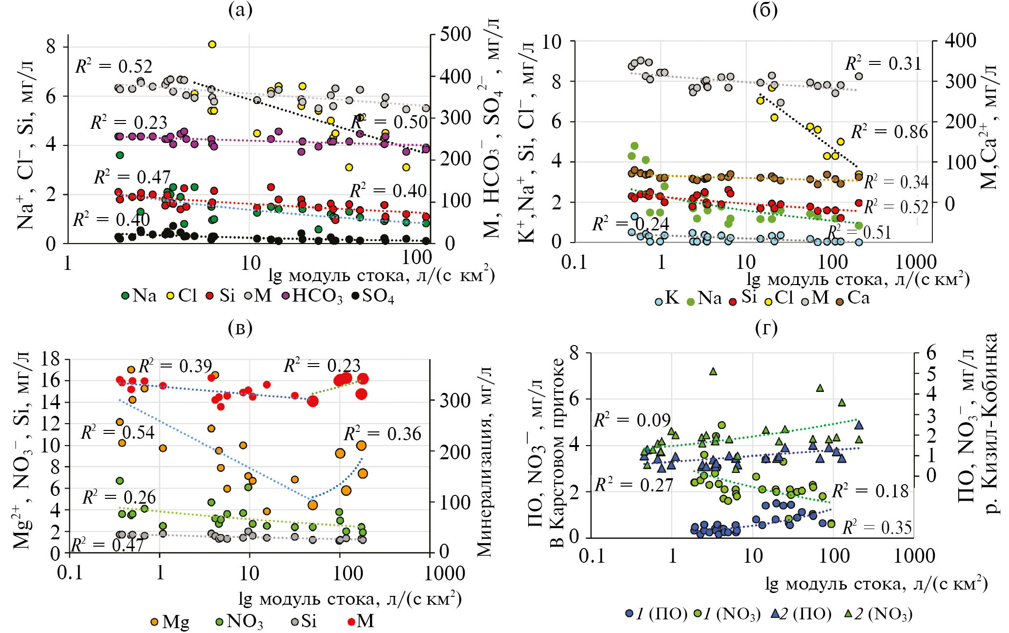 Тенденции снижения концентрации с увеличением стока характерны для вод Карстового источника по SO42– и HCO3– (рис. 4а) и р. Кизилкобинки по K+ и Ca2+ (рис. 4б), что объясняется общей причиной – обильным поступлением атмосферных вод во время паводков. Тенденция снижения концентрации Si проявляется во всех КВС (рис. 4). А снижение концентрации Cl– и Na+ характерно для вод р. Кизилкобинки и Карстового источника. Примечательно, что зависимость Cl– от водности проявляется в более высоких диапазонах модулей стока: в Карстовом источнике при >5л/(скм2), в р. Кизилкобинке при >15л/(скм2). Ниже указанных модулей стока отмечается размах концентраций Cl– во всем диапазоне измерений (табл. 3), что говорит о случайном характере его колебаний. Концентрации Na+ во всех водах КВС малы: относительно большие значения (>2.3 мг/л) отмечаются в р. Кизилкобинке и Карстовом источнике, в Аянском источнике – значения находятся уровне нижней границы определения.