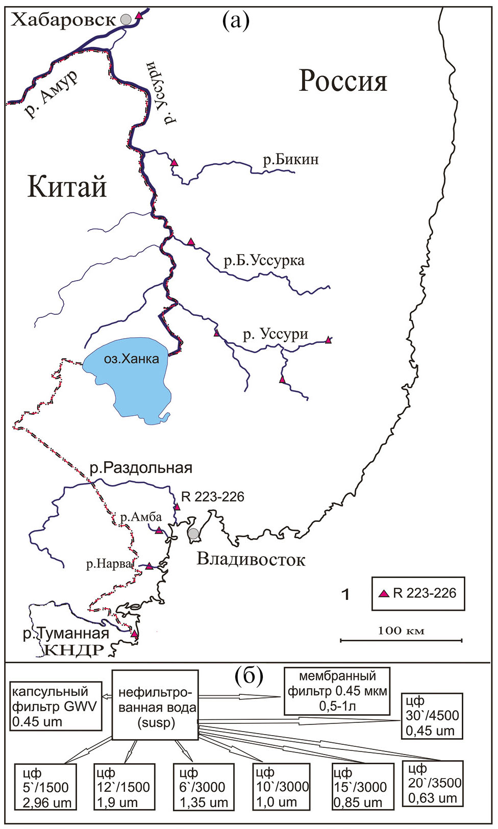 Кроме того, для характеристики зависимости интенсивности ДРС от количества взвеси в речных водах, а также для сравнения фильтратов через капсульный фильтр 0.45 мкм и супернатантов при наиболее интенсивном режиме центрифугирования (30′ при 4500 об/мин) использовали еще 20 проб из других рек южных районов ДВ РФ (Туманная, Нарва, Амба, Раздольная, Уссури, и Амур) с содержанием взвеси в диапазоне от 4.6 до 450 мг/л, отобранных с октября 2022 г. по апрель 2023 г. Район работ с точками отбора проб представлен на рис. 1а.