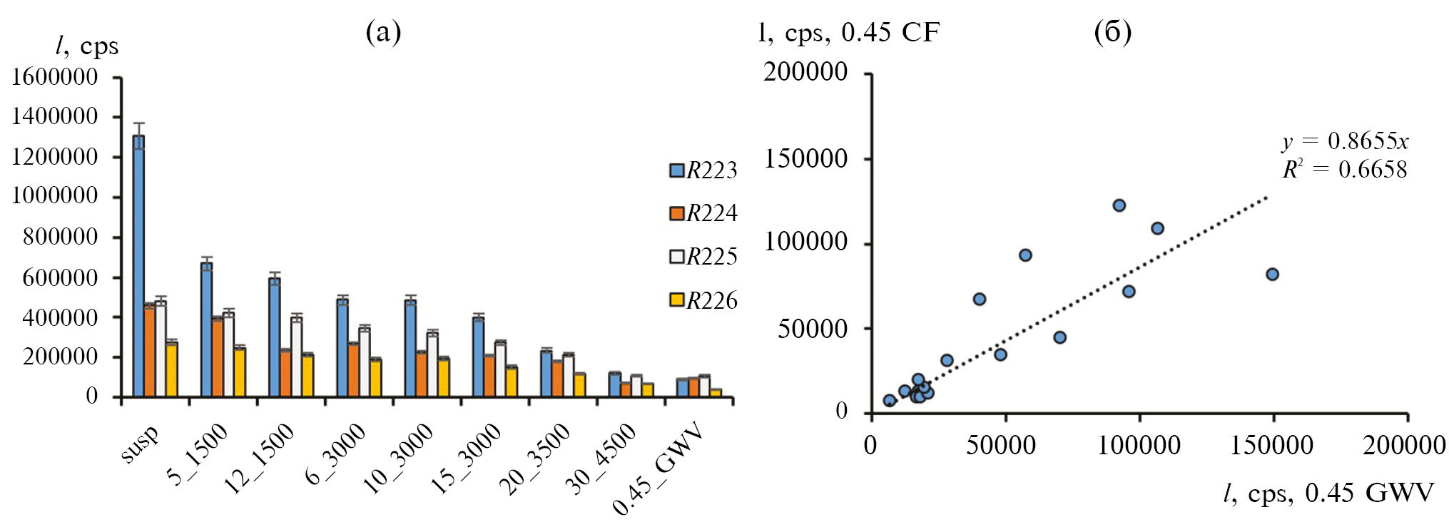 Интенсивность ДРС супернатантов закономерно снижалась при увеличении времени и скорости центрифугирования (рис. 3а). Это согласуется с исходной гипотезой о пропорциональности содержания частиц и интенсивности ДРС в речных водах и подтверждает возможность использования центрифугирования для разделения коллоидных и взвешенных частиц. Вместе с тем при большинстве режимов центрифугирования, рассчитанных исходя из плотности частиц 2.5 и 1.65 г/см3, использованных в работах по разделению частиц почв [12, 24], интенсивность ДРС в супернатантах оказалась существенно больше, чем в растворах, полученных после фильтрации через капсульный фильтр 0.45 мкм (рис. 3а). Только при увеличении времени центрифугирования до 30′ при 4500 об/мин интенсивность ДРС в супернатанте становится сравнима с таковой в фильтрате 0.45 мкм (рис. 3б). Это позволяет предположить, что при режиме центрифугирования 30′/4500 об/мин осаждаются все частицы крупнее 0.45 мкм или их большинство.