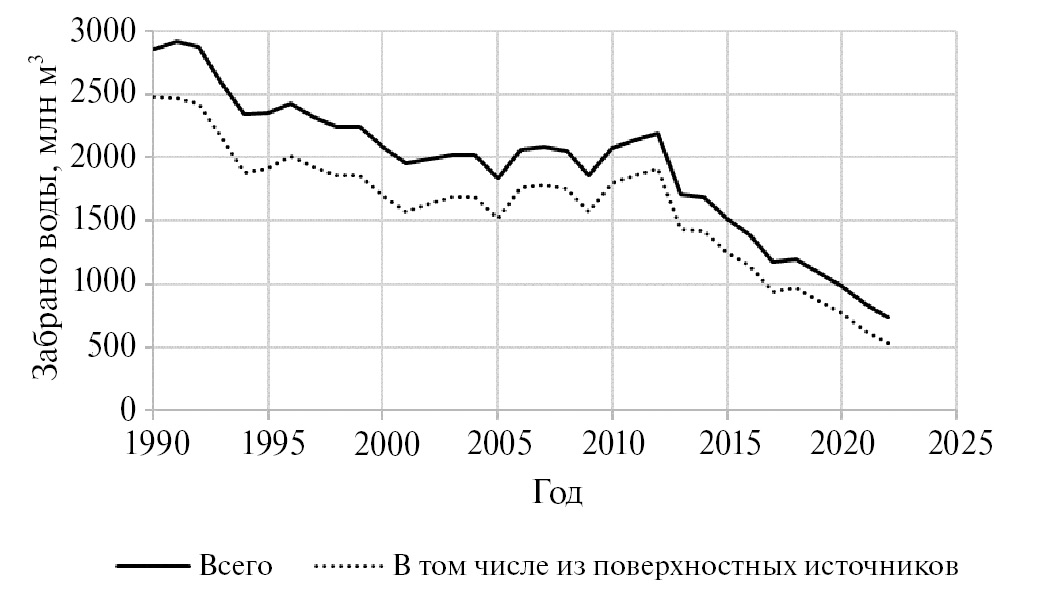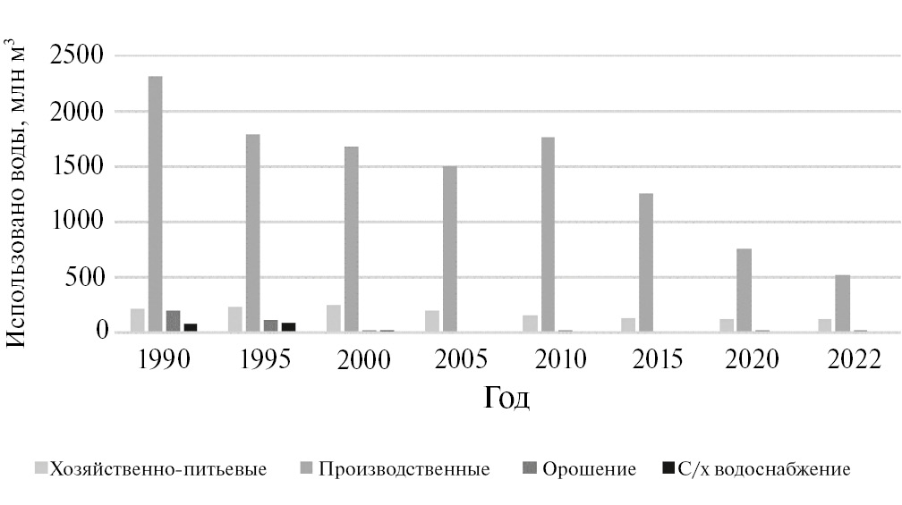 За период 1990–2022 гг. забор воды в российской части бассейна р. Урал для удовлетворения нужд населения и объектов экономики сократился в 3.9 раза – с 2.86 до 0.74 км3 [2–10, 14, 28]. Связано это в основном с падением объемов производства промышленной и сельскохозяйственной продукции и лишь частично с развитием оборотного водоснабжения и с внедрением водосберегающей техники в ЖКХ и сельском хозяйстве (рис. 1).