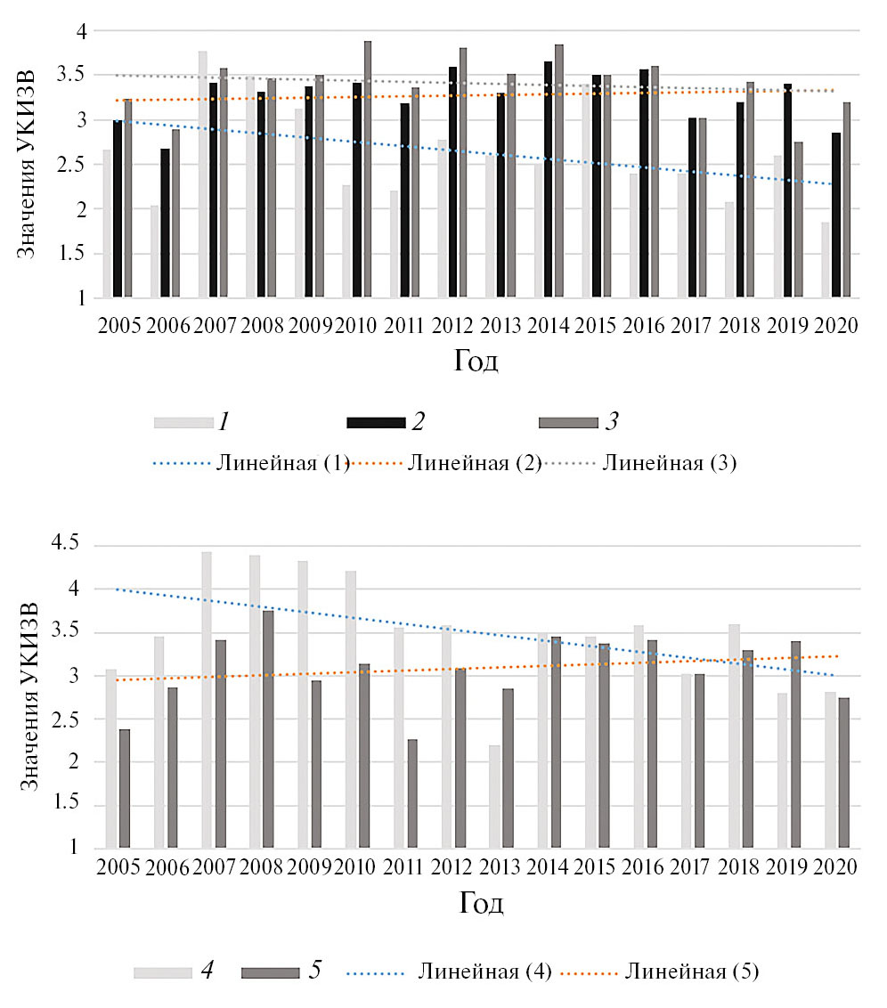 Рис. 6. Значения УКИЗВ р. Урал за 2005–2020 гг. в Оренбургской области: 1 – Ириклинское водохранилище, пгт Ирикла; 2 – 6.5 км ниже г. Орска; 3 – Новотроицк; 4 – 0.5 км ниже ГОС Оренбурга; 5 – 1 км выше п. Илек.