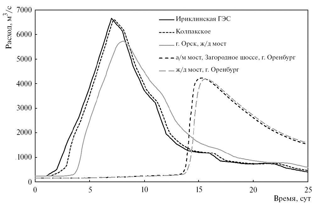 На более протяженном участке от Орских ворот до г. Оренбурга трансформация гидрографа более заметная (максимальный расход снижается почти до 4 тыс. м3/с); причем ветвь подъема гидрографа становится очень крутой (от минимальных до максимальных значений расход нарастает за 1 сут, тогда как при сбросе с Ириклинской ГЭС это происходит за 6 сут). Это интересное явление (некий “кумулятивный эффект”) требует специального анализа.