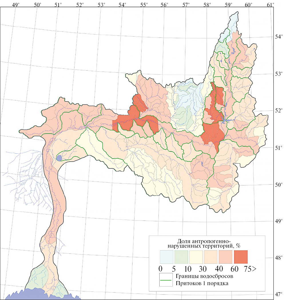 Рис. 3. Доля антропогенно-нарушенных территорий в бассейне р. Урал.