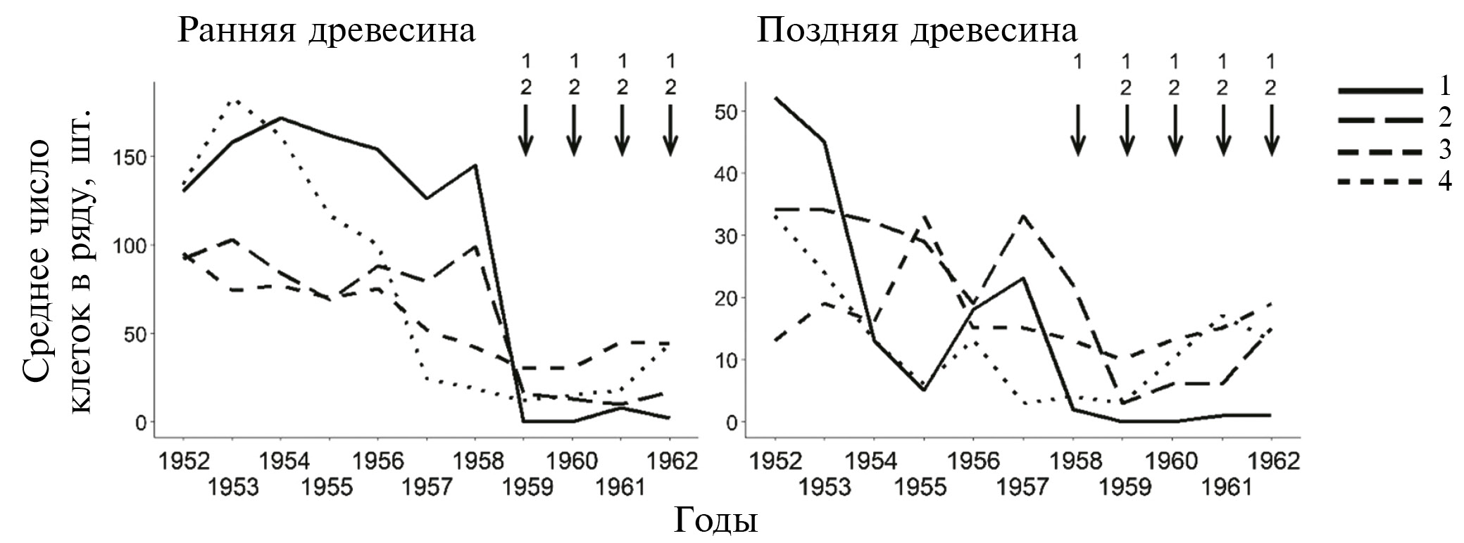 Рис. 2. Изменчивость числа клеток ксилемы четырех деревьев сосны обыкновенной (1–4) на территории ВУРСа. Стрелками показаны годы после Кыштымской аварии (1958–1962), в которые среднее число клеток в ряду в 2 раза и более ниже этого показателя в доаварийные годы (1952–1957). Цифры над стрелками соответствует номеру деревьев