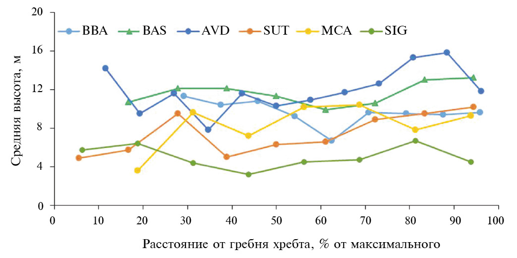 Рис. 7. Изменение средней высоты древостоев по мере удаления от гребня хребта в переходной зоне лес–горная степь на склонах гор массивов Южный и Северный Крака: BBA – Большой Башарт, BAS – Башарт, AVD – Авдэктэ, SUT – Суртанды, MCA – Малая Саргая, SIG – Малый Крака