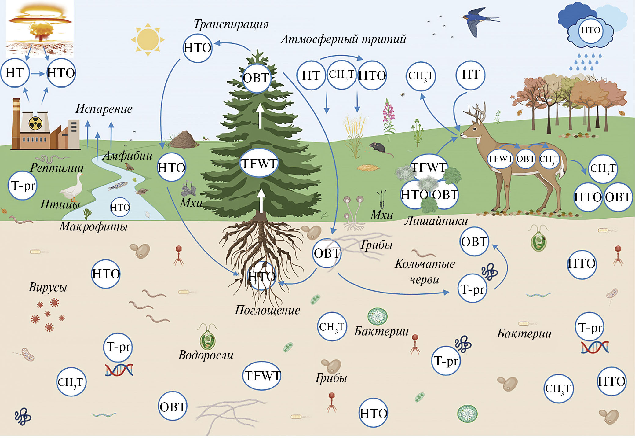 Развивая идеи Н.В. Тимофеева-Ресовского об элементарных биологических структурах и явлениях на разных уровнях комплексности жизни в биосфере (молекулярно-клеточный, организменный, популяционный, экосистемный и биосферный) [37], в последние десятилетия рабочие группы Международного союза радиоэкологов (МСР), основываясь на данных, связанных с риском для отдельных организмов, обосновывают необходимость добавления популяционного и экосистемного подходов к набору инструментов, доступных для управления радиационной безопасностью [38–43]. К настоящему времени научными коллективами разных стран накоплены значительные данные о миграции разных форм и соединений 3H в окружающей среде [1, 44–46], метаболизме и накоплении биотой [47–53], разработаны модели для оценки мощности поглощенной дозы трития [54–59]. На лабораторных животных достаточно подробно изучено поступление разных форм и соединений трития в организм, распределение их в органах и тканях, пути выведения, токсичность для разных биологических уровней и относительная биологическая эффективность (ОБЭ) [59].