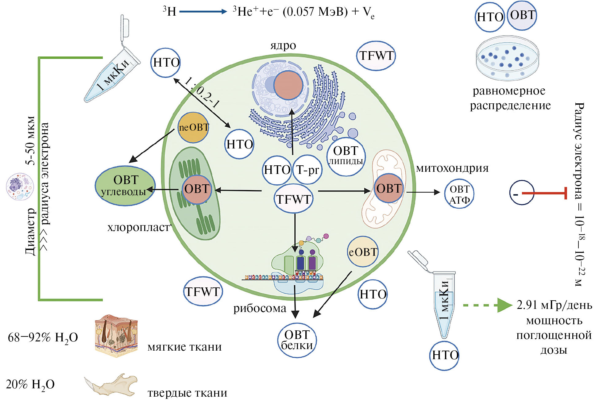 Бета-излучатель тритий (3H) с периодом полураспада около 12.3 года имеет естественное и техногенное происхождение [1–4]. Он существует в нескольких формах и химических соединениях: тритиевая несвязанная вода (HTO, T2O, DTO), встречается в окружающей среде; водная несвязанная тканями форма 3H, тритий свободной воды тканей, неорганически связанный тритий (TFWT); органически связанный с белками, полисахаридами и липидами 3H (OBT): обменный (связан с атомами O2, S и N2, eOBT), необменный (связан с атомами C, neOBT) и суммарный (tOBT=eOBT+neOBT); меченные 3H прекурсоры (предшественники нуклеиновых и аминокислот); нерастворимые соединения и меченные 3H газы (HT, T2, CH3T и др.) [5–8].