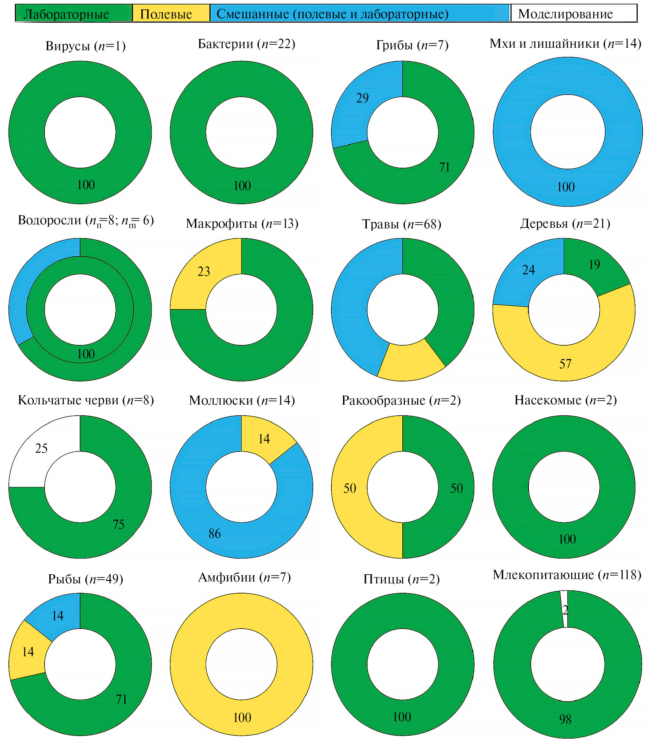 При расчете доли исследований с оценками дозовых нагрузок трития за единицу принимали биологический вид и число экспериментов, т.е. если в одной публикации участвовали две конечные точки или более (в данном случае – референтные виды) или различные условия воздействия (формы и соединения трития), их считали отдельными исследованиями. Согласно ICNafp [63], латинские названия таксонов в статье обозначены курсивом независимо от их рангов.