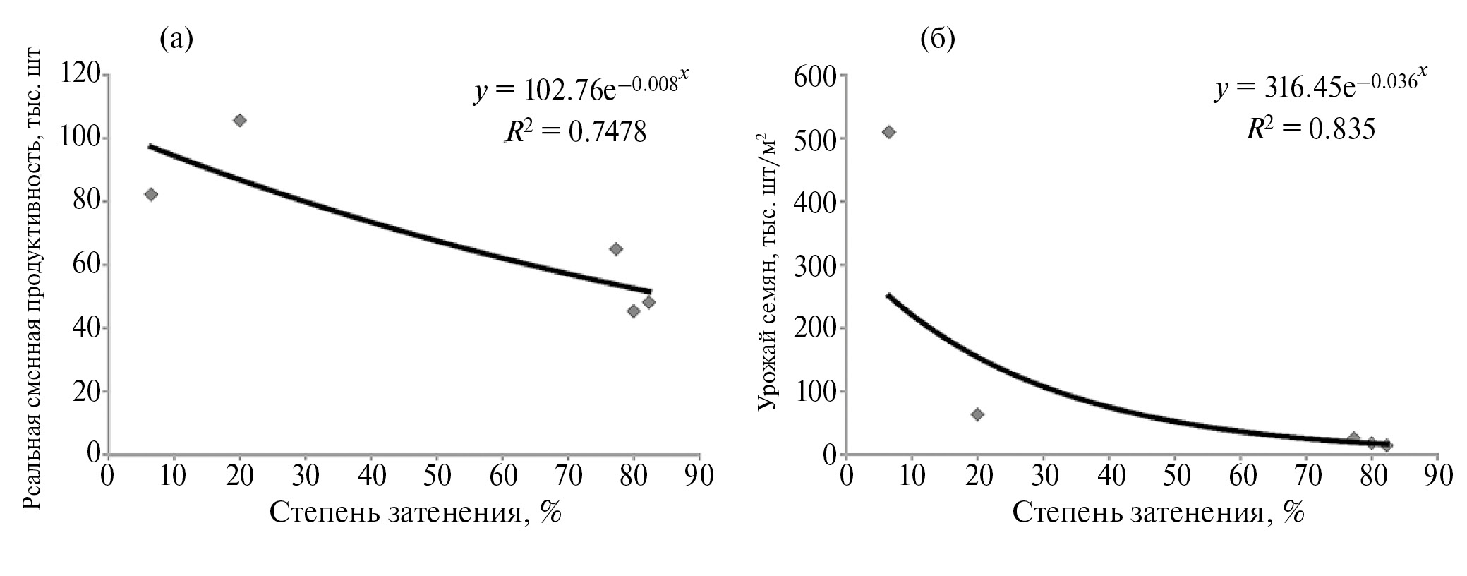 Реальная семенная продуктивность особи, учитывающая число полноценных семян в плоде, число цветков и долю завязавшихся плодов, составила от 45.3 до 105.6 тыс. семян на растение в разных популяциях. Отмечен тренд уменьшения этого показателя при увеличении степени затенения (рис. 1а).
