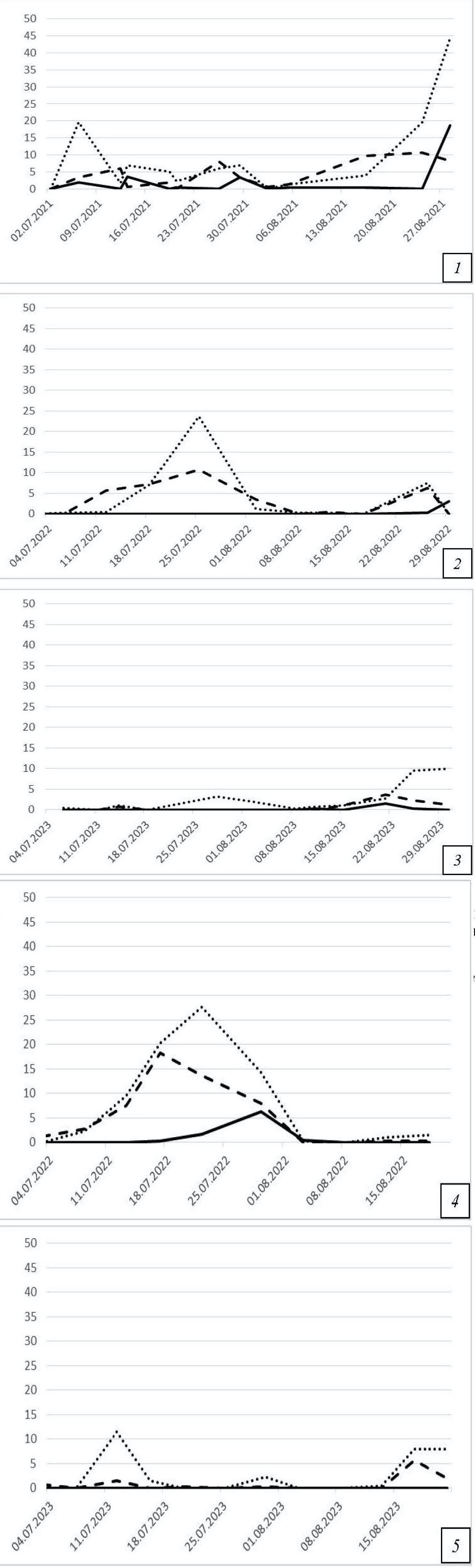 Рис. 3. Динамика отлова имаго хлопковой совки в расчете на 1 ловушку, снабженную одним из трех типов приманок в окрестностях пос. Ботаника (1–3) и станицы Курчанская (4, 5) Краснодарского края в 2021 (1), 2022 (2, 4) и 2023 гг. (3, 5)
