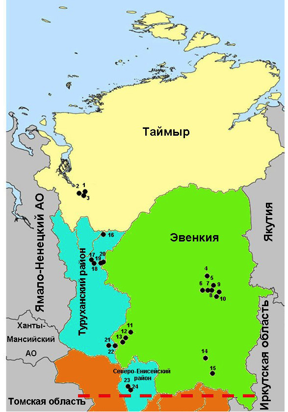 Рис. 1. Карта севера Енисейской Сибири с указанием мест сбора.