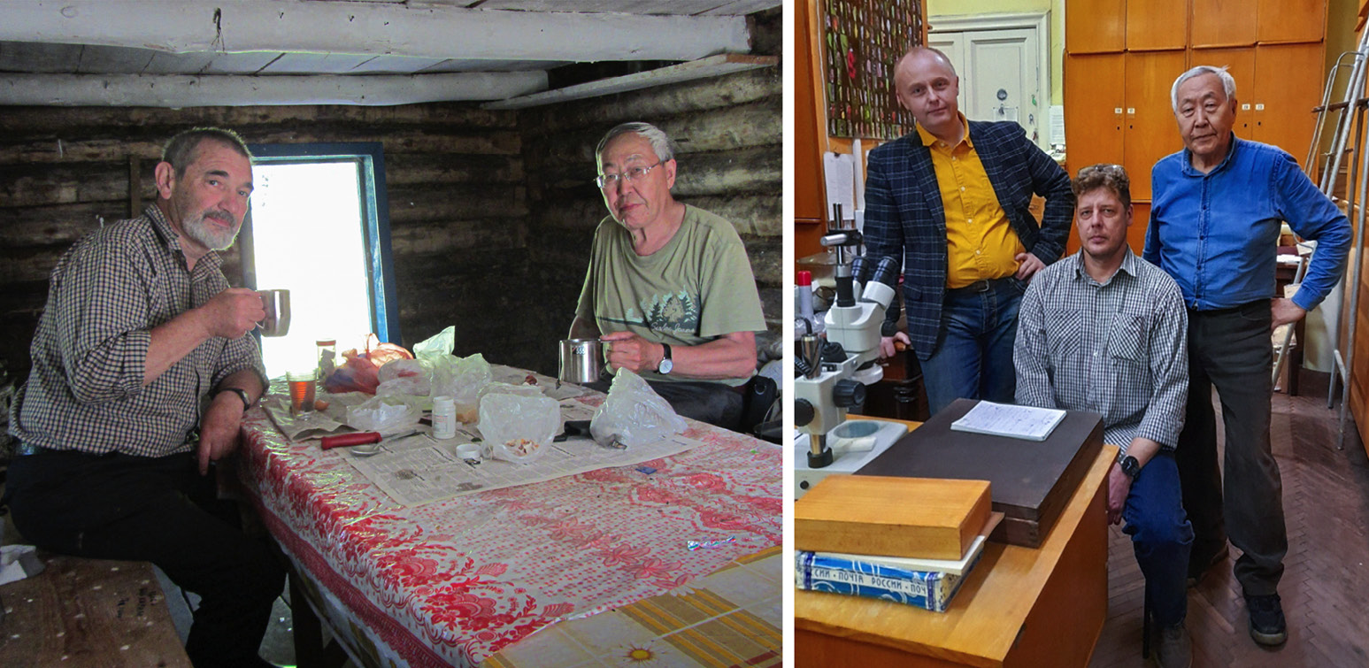 Николай Николаевич с В. Б. Голубом во время экспедиции в Южно-Уральском заповеднике 6 августа 2014 г. (слева) и с коллегами В. М. Гнездиловым (слева) и Ф. В. Константиновым (в центре) в 23-м «клопином» кабинете Зоологического института РАН 27 октября 2021 г. (справа).