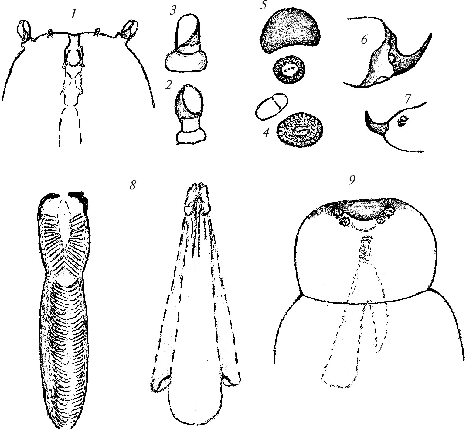 1, 9 – голова сверху; 2, 3 – усик; 4, 5 – переднегрудное дыхальце и склеротизованная пластинка; 6, 7 – последний сегмент тела сбоку; 8 – глотка снизу