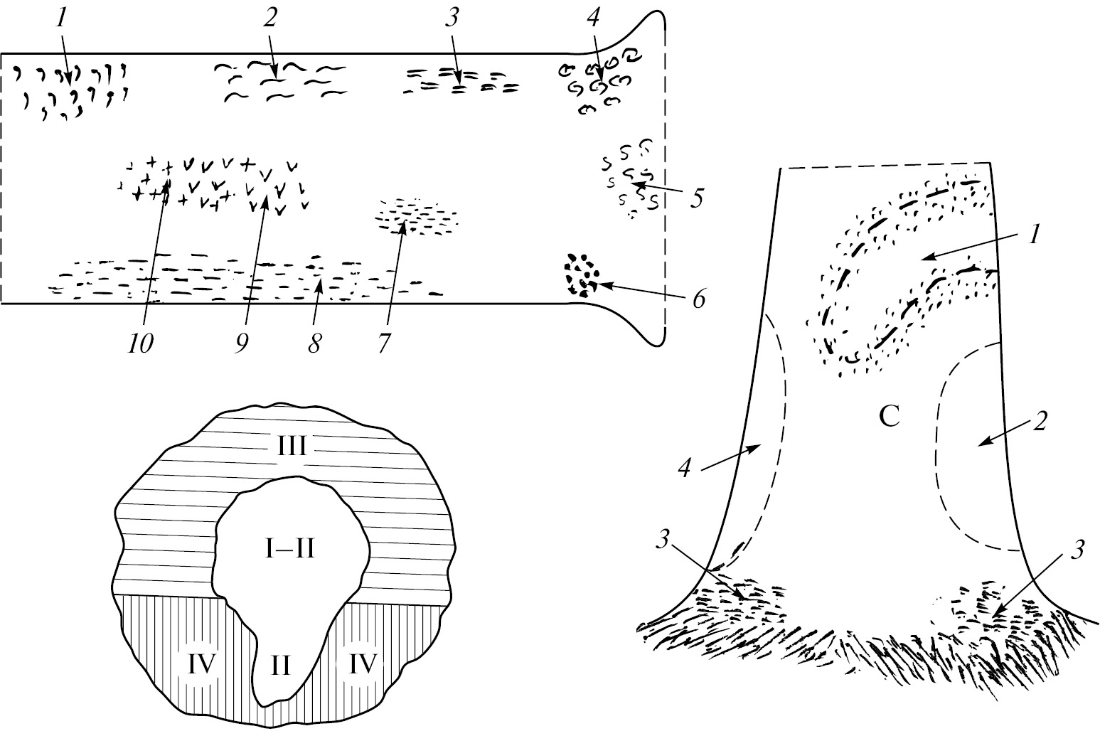 B — поперечный разрез ствола: I, II — клюзиидный комплекс (II — расположение туманниц (сем. Canthyloscelidae)); III — аксимиидно-сирфидный комплекс; IV — пахиневридно-типулидный комплекс