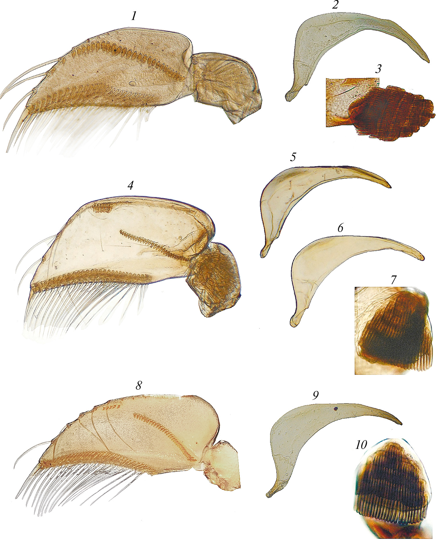 Рис. 4. Sigara spp., самец, передняя лапка (1, 4, 8), правый парамер (2, 5, 9) и стригил (3, 7, 10)