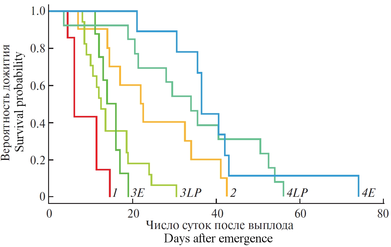 LP — группы имаго, развившихся из личинок и куколок, собранных в природе. Е — группы имаго, развившихся из эмбрионов в лабораторных условиях. * — значения получены с использованием модели Яна–Прентиса. При использовании классического логрангового критерия получены более высокие значения р (0.833 и 0.551 соответственно). | |||