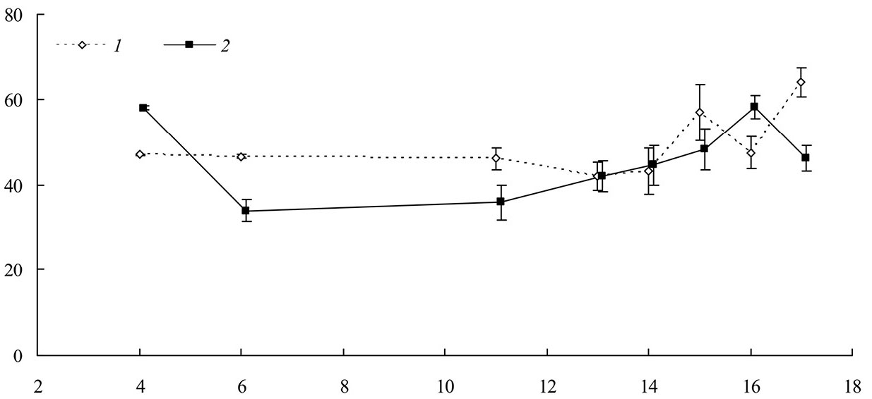 Рис. 6. Плодовитость самок из ставропольской и ВИЗР популяций Orius laevigatus (Fieber) в ряду поколений при разведении на каланхоэ. По горизонтальной оси — последовательные поколения; по вертикальной оси — плодовитость (число яиц на 1 самку, среднее и его ошибка). Популяции: 1 – ставропольская, 2 – ВИЗР.