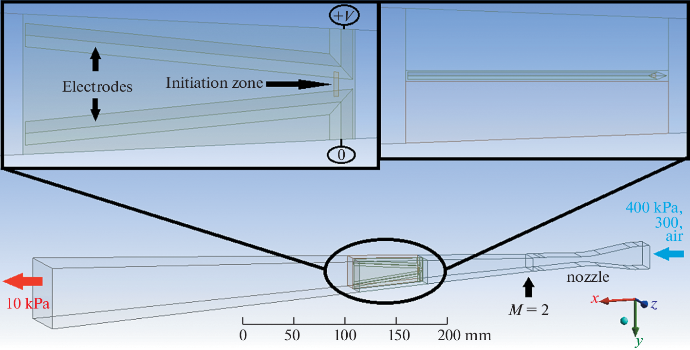 Three-dimensional distributions of velocity, temperature and pressure in the supersonic air flow at M = 2, as well as the current density in the discharge initiated in it, are obtained. A direct current gas discharge of 10 A is considered in the hydrodynamic approximation within the channel model. The evolution of a transverse–longitudinal discharge is considered in the time range t up to 20 µs. It is shown that the discharge moves almost at the velocity of the main supersonic air flow disturbing it rather weakly. Based on the characteristic values of the current density and gas temperature of 8000–10 000 K obtained in the calculations, the electron density in the discharge channel is estimated as ne ~ 1016 cm–3. The field strength of E ~ 125 V/cm is estimated and the reduced field strength in the discharge channel E/N is about 30 Td. In the configuration of an aerodynamic model with shortened electrodes, the transition to the discharge phase fixed at their ends is shown.
