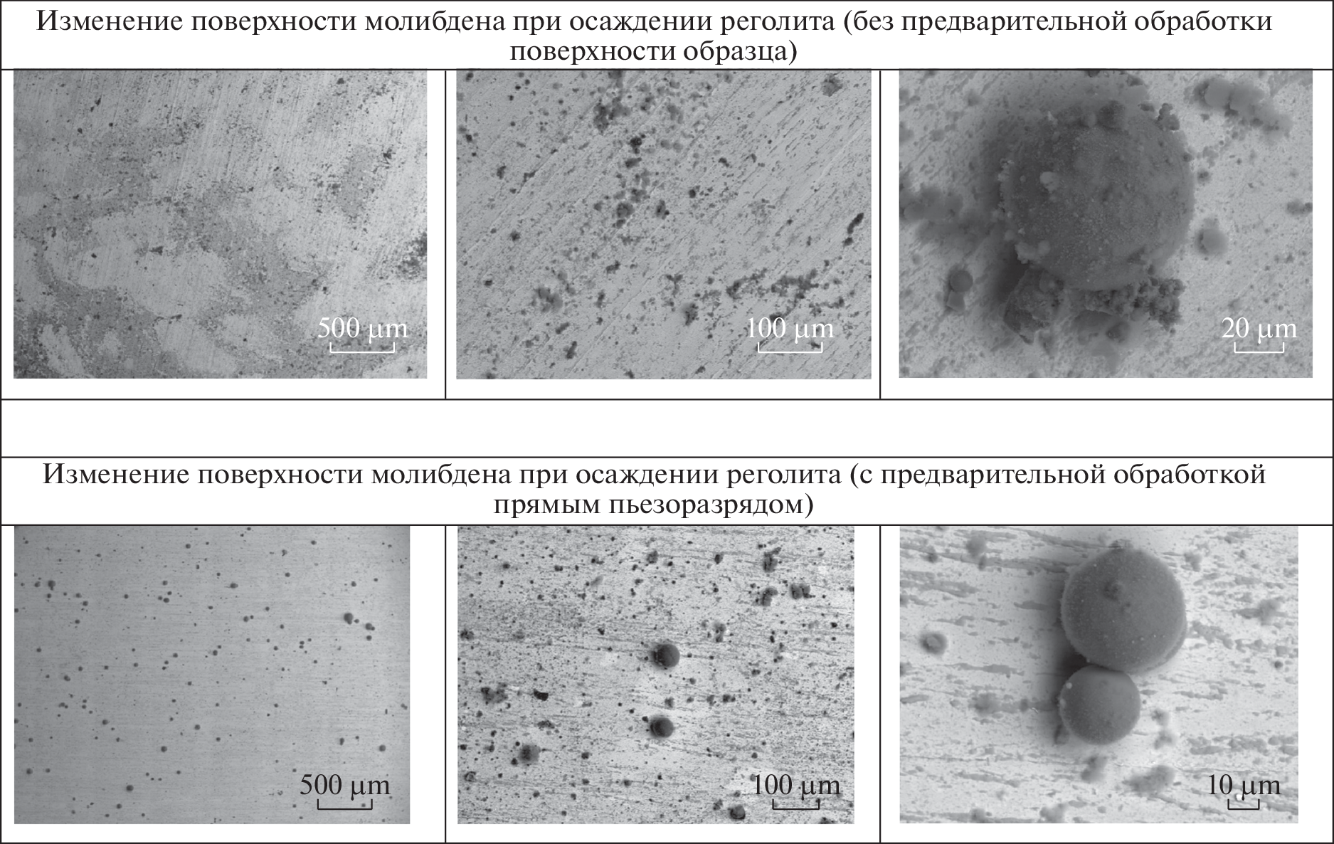 Experimental results are presented on deposition of charged particles that imitate the levitating dust of regolith (dusty plasma) on the Moon on metal plates. The experiment was based on the analogy between the physical–chemical properties of the processes that develop in regolith during microwave discharge excited by the radiation of a powerful gyrotron in the powder of regolith (lunar dust) and the processes that occur on the Moon during the bombardment of its surface by micrometeorites. The action is studied of the levitating dust cloud on plates made from molybdenum and tantalum with a size of 10 × 40 mm. The results are compared with the experiment on deposition of lunar dust on plates from stainless steel. It is shown that dust particles in the shape of spheroids of different sizes are deposited on the plates. The size distribution of these particles and their chemical composition are those of lunar regolith. It is found that the uniformity of dust deposition can be controlled by preliminary processing of the metal plates by the low-temperature plasma of a direct piezodischarge. It is shown that the levitating dust obtained under laboratory conditions (ensembles of charged regolith particles) can be used in imitation experiments on surface modification of different materials and in the development of methods for cleaning the space equipment during Moon missions.