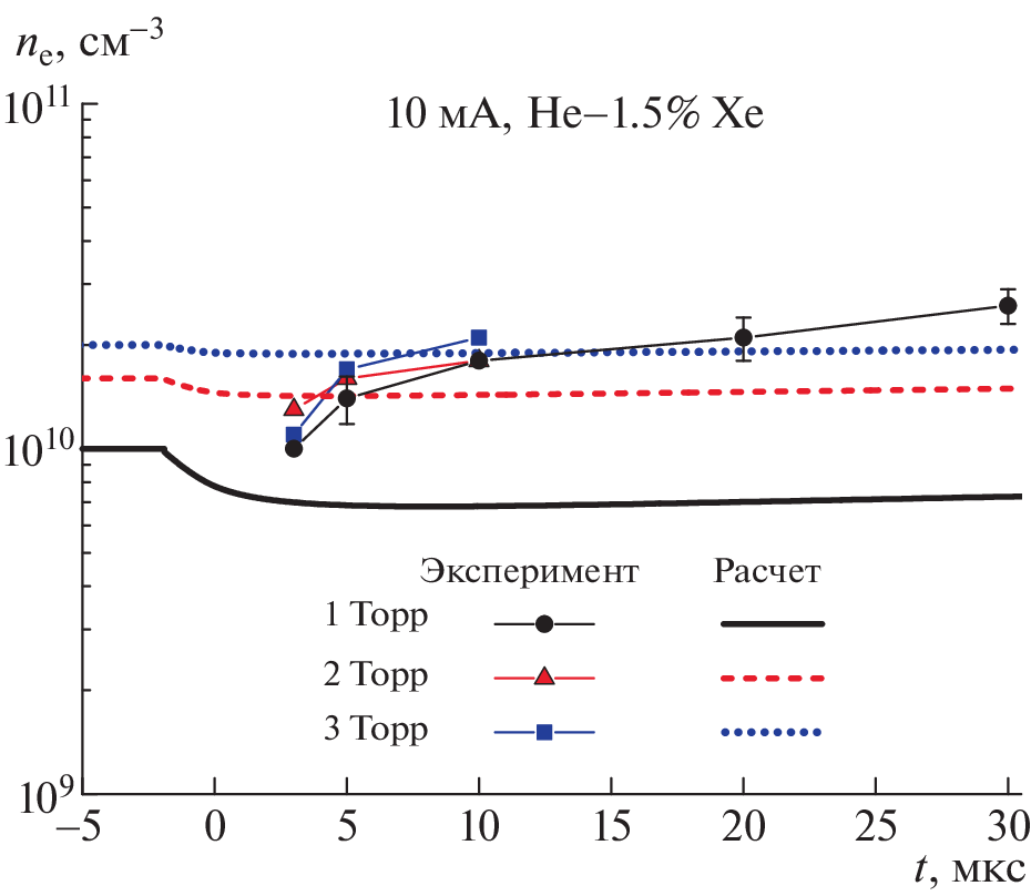 Experimental and computational-theoretical studies of the electron energy distribution function (EEDF) at the afterglow stage of a glow discharge in a mixture of helium (content of 98.5% He) and xenon (content of 1.5% Xe) for pressures of 1, 2, and 3 Torr and a discharge current of 10 mA are carried out. The discharge is ignited in a tube with a radius of 1.25 cm. According to the measurements, the electron energy distribution function (EEDF) has a form close to the Maxwellian function in the low-energy region. A characteristic feature of the measured distribution functions is also a plateau in the energy range of 1–4 eV. The formation of this plateau is associated with fast electrons (4.5 eV) formed during chemionization with the participation of metastable xenon atoms. The calculations are performed within the nonstationary Boltzmann equation in the local approximation for the EEDF, taking into account the source of fast electrons. Experimental and calculated results are compared.