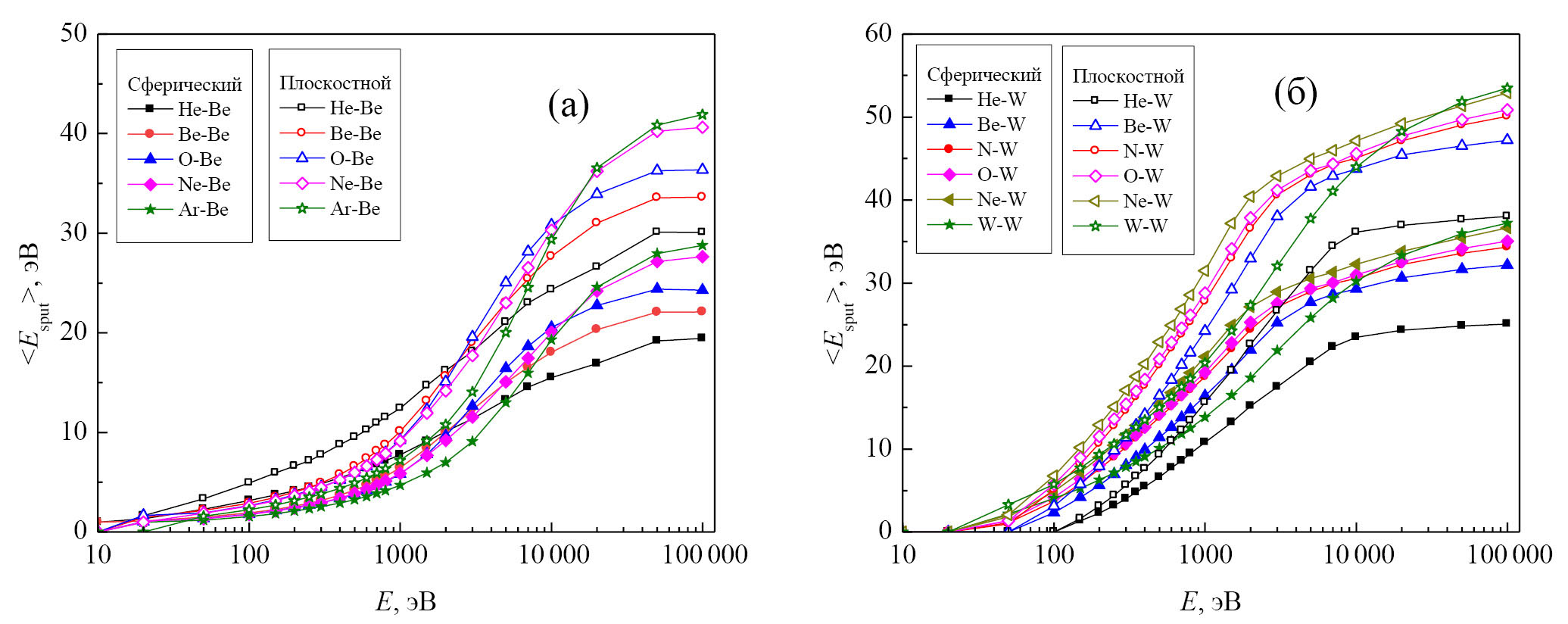 Электронная температура в районе сепаратрисы может составлять 100–150 эВ, электронная плотность – 1013 частиц/см3 [5]. При этих параметрах частицы примесей присутствуют в плазме в виде многозарядных ионов. При бомбардировке дивертора ионы примесей ускоряются потенциалом плазма-стенка, их энергия существенно увеличивается. Тем самым, ионы примесей могут вызвать значительно большее распыление дивертора, по сравнению с распылением водородными частицами. Таким образом, достоверная информация о коэффициентах распыления бериллия и вольфрама примесями важна для оценки работоспособности материалов, применяемых в токамаке ИТЭР.