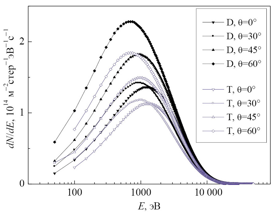 На рис. 11 представлены энергетические спектры dN/dE атомов дейтерия и трития, бомбардирующих первую стенку токамака, полученные с помощью программы DOUBLE-MC в работе [4]. Видно, что спектр содержит частицы в широком диапазоне энергий, а максимум распределения лежит в районе 1 кэВ. При увеличении угла θn увеличивается интенсивность потока атомов, покидающих плазму, и спектр смещается в сторону меньших энергий.