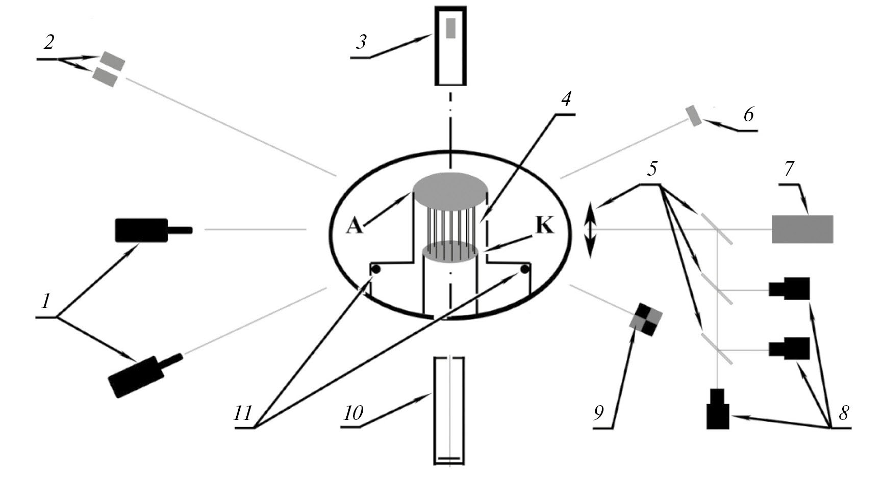 Рис. 1. Схема эксперимента: 1 – сцинтилляционные детекторы, снабжённые свинцовыми фильтрами; 2 — полупроводниковые детекторы МР-излучения AXUV-5; 3 — полупроводниковый детектор СKД1-02 с коллиматором; 4 — проволочная сборка; 5 — линза и зеркала оптической системы; 6 –детектор СППД2-02; 7 — электронно-оптическая щелевая развертка; 8 — три оптических кадровых ЭОПа; 9 — четырёхкадровый рентгеновский ЭОП; 10 — камера-обскура; 11 — магнитные петли для измерения тока; А — анод; К — катод