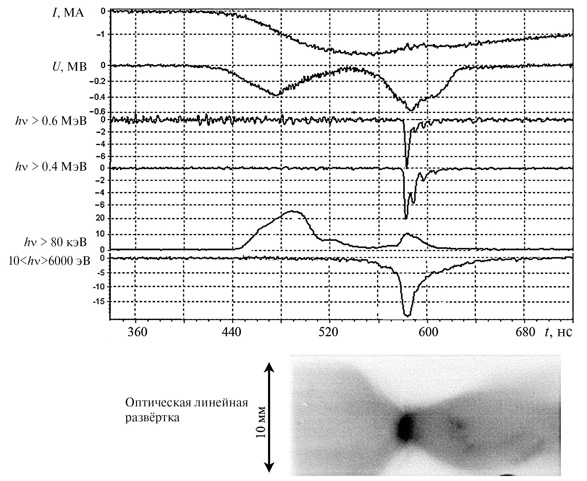 Рис. 2. Пуск 06.06 № 2. Осциллограммы тока I [МА]; напряжения U [МВ]; импульсов сверхжёсткого рентгеновского излучения в условных диапазонах hν > 600 кэВ и hν > 400 кэВ; жёсткого рентгеновского излучения в диапазоне hν > 80 кэВ; мягкого рентгеновского излучения с энергией 10 < hν < 6000 эВ, и хронограмма сжатия многопроволочной сборки в видимом свете. Мощность излучения представлена в относительных единицах