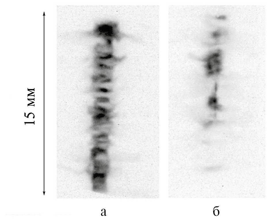 Максимальная энергия сверхжёсткого рентгеновского излучения обычно превосходила заряд электрона, умноженный на напряжение, которое измерялось на центральном узле вакуумного концентратора установки в момент появления излучения. Высокие значения энергии сверхжёсткого рентгеновского излучения свидетельствуют об ускорении в разряде пинча электронной компоненты до энергии, существенно превышающей 400 кэВ. На появление быстрых электронов непосредственно в области горячей плазмы указывает и генерация жёсткого тормозного излучения с энергией hν ≥ 50 кэВ, измеренного на оси сборки детектором СКД1-02, расположенным за коллиматором со стороны анода (рис. 4 пуск 06.04 № 2). На рентгеновских снимках (рис. 5) представлены рентгеновские фотографии максимальной фазы сжатия двухкаскадного и одиночного лайнеров. Следует отметить, что в экспериментах с одиночными алюминиевыми лайнерами образование вдоль оси большого количества ГТ не наблюдалось (рис. 5б). При этом СЖР-излучение также регистрировалось (см. табл. 1).