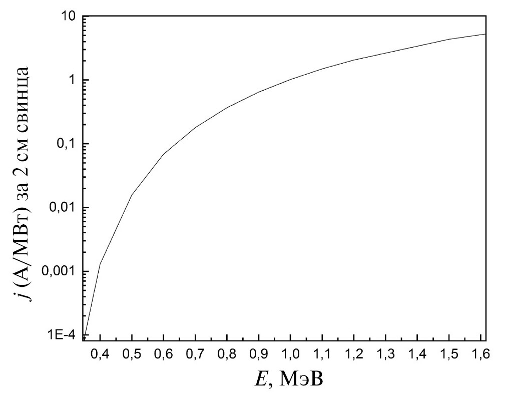 Рис. 6. Расчётный ток сцинтилляционного детектора, закрытого свинцовым фильтром толщиной 2 см, на удалении 11.4 м в зависимости от энергии электронов