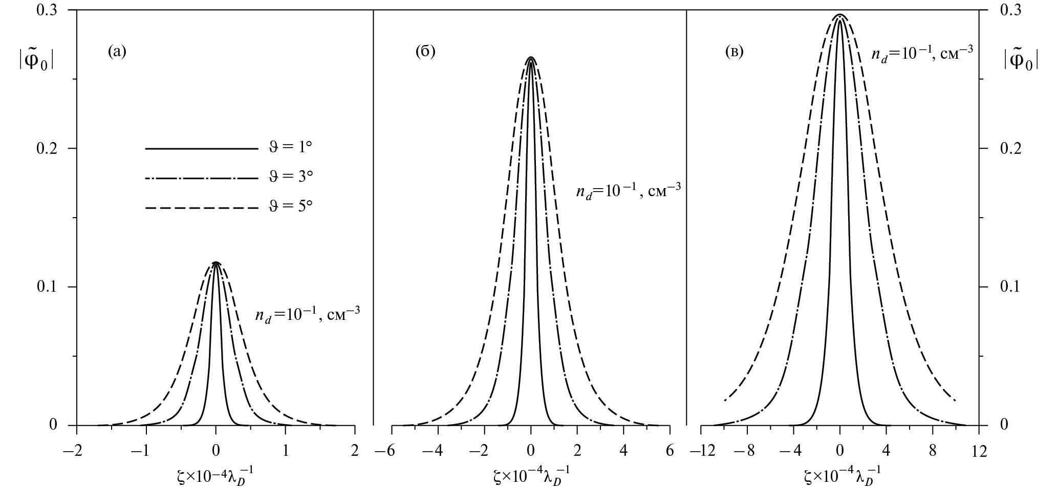 Рис. 1. Характерный вид одномерных солитонов, распространяющихся под углом к магнитному полю: = 1° — сплошная кривая, = 3° — штрихпунктирная кривая, = 5° — штриховая кривая. Графики построены для трех случаев возможных концентраций пылевых частиц: nd0 = 10–4 см–3 (а), nd0 = 10–3 см–3 (б), nd0 = 10–2 см–3 (в)